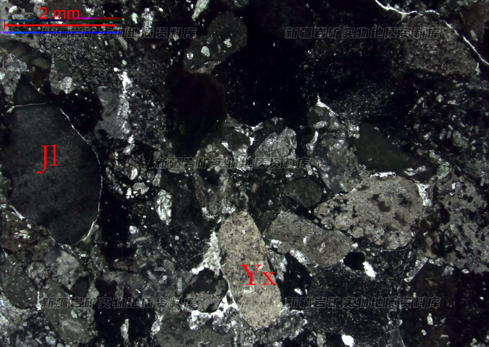 岩屑(Yx)圆状,为安山岩岩屑、凝灰岩岩屑、霏细岩岩屑等;角砾(Jl)圆状,其成分与岩屑相同。
