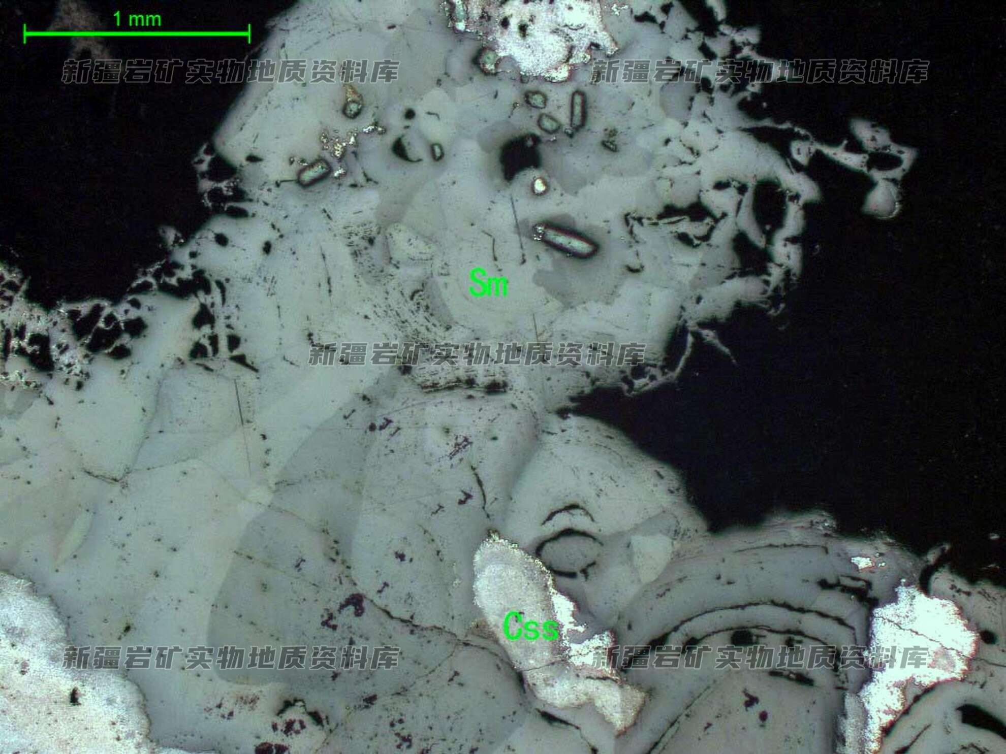 岩石特征描述: 在孔洞边缘菱锌矿(Sm)具环带构造,集合体与白铅矿(Css)一起呈皮壳状分布。