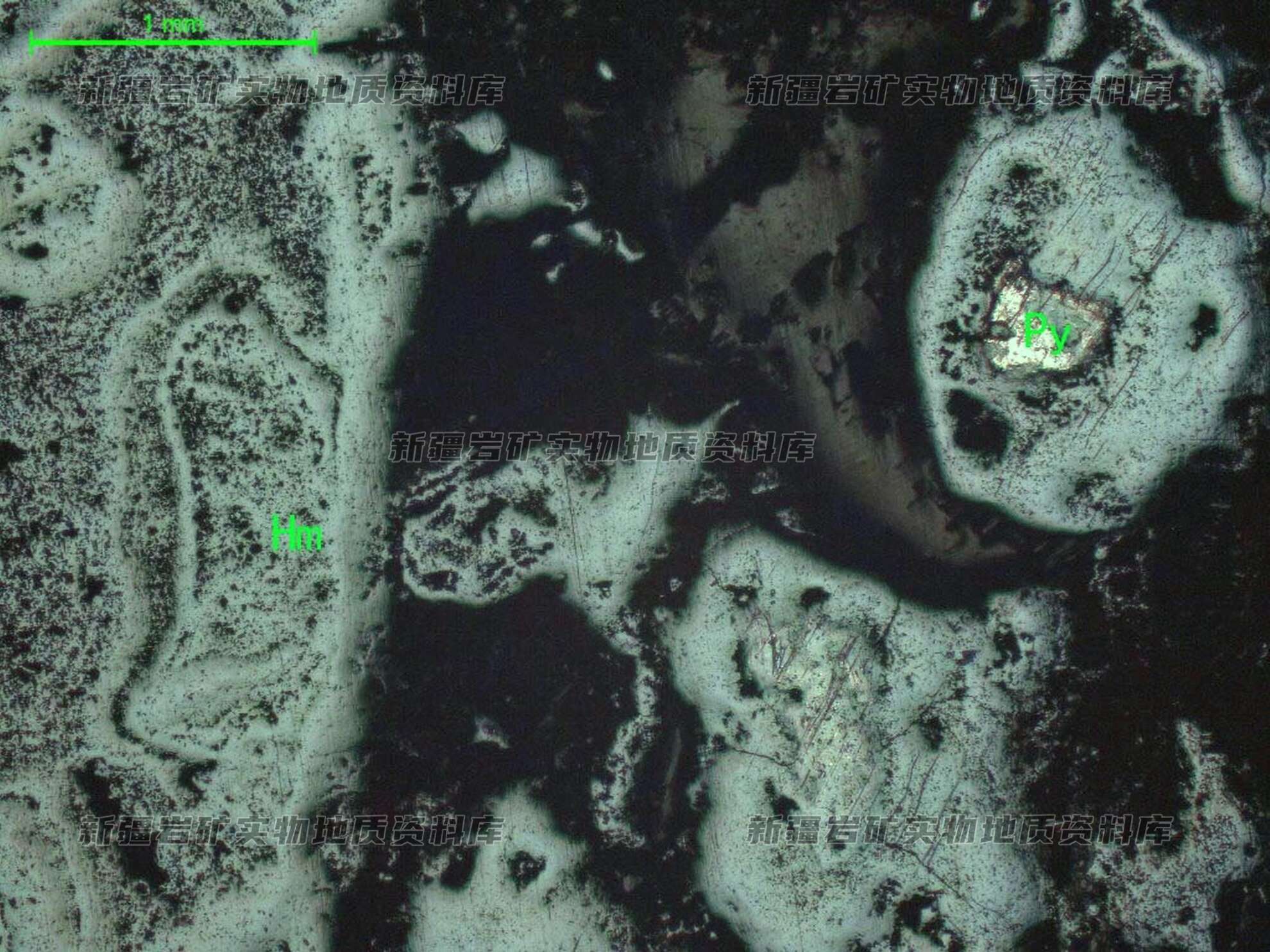 岩石特征描述: 史密斯矿?(Py)半自形粒状,呈单晶分布透明矿物粒间,现多被褐铁矿(Hm)沿边缘交代呈残晶状分布。