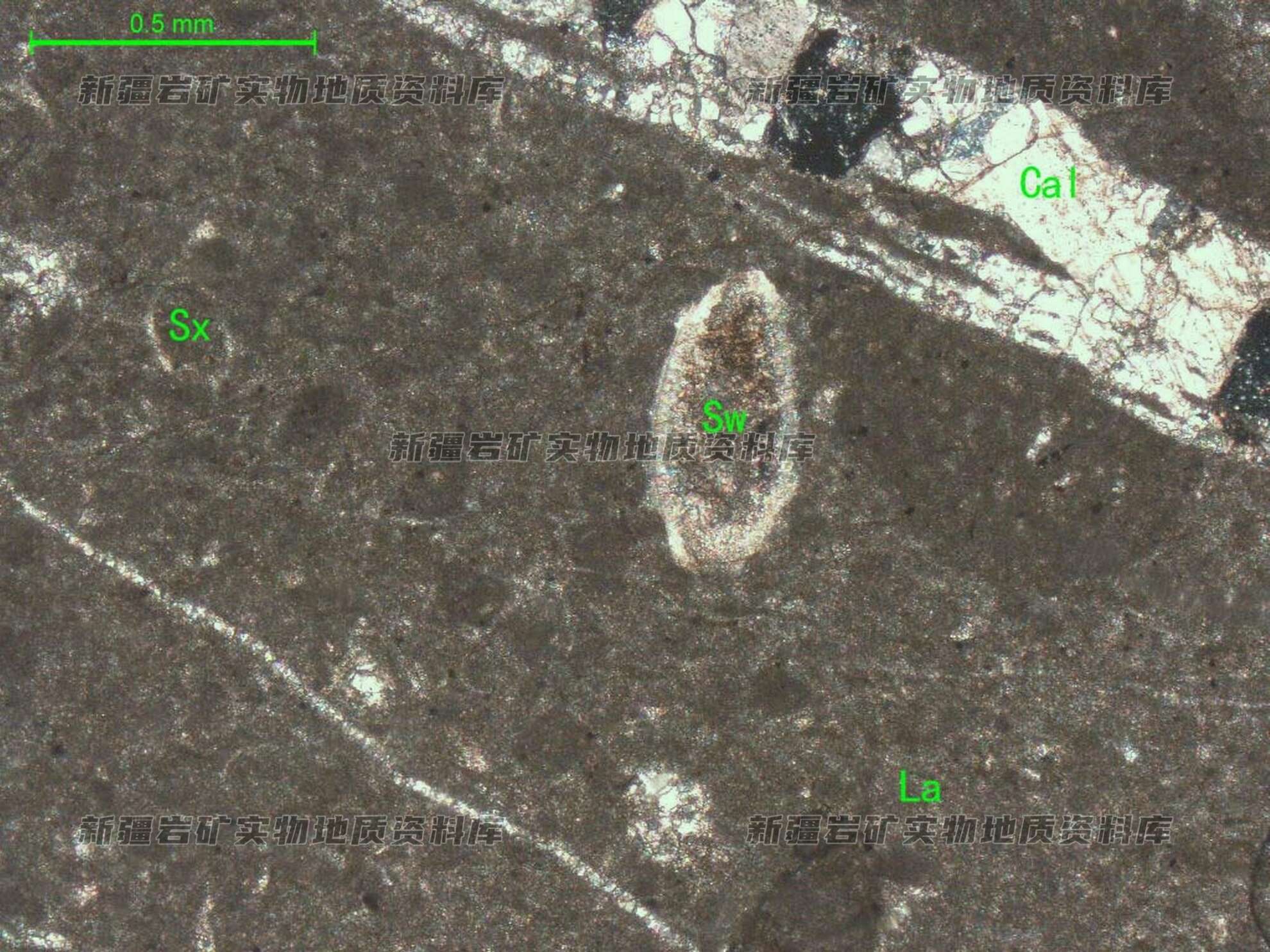 岩石特征描述: 岩石主要有砂屑(Sx)和亮晶方解石(La)组成,其中可见少量介形虫(Sw)生物碎屑分布,岩石中可见细脉由较干净的方解石(Cal)充填。