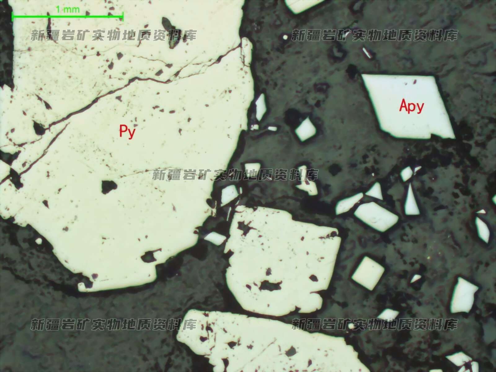 岩石特征描述: 岩石中金属矿物主要见半自形-自形黄铁矿(Py)、菱形毒砂(Apy)呈星点浸染状分布透明矿物粒间。光片中金属矿物由黄铁矿、磁铁矿、毒砂组成。