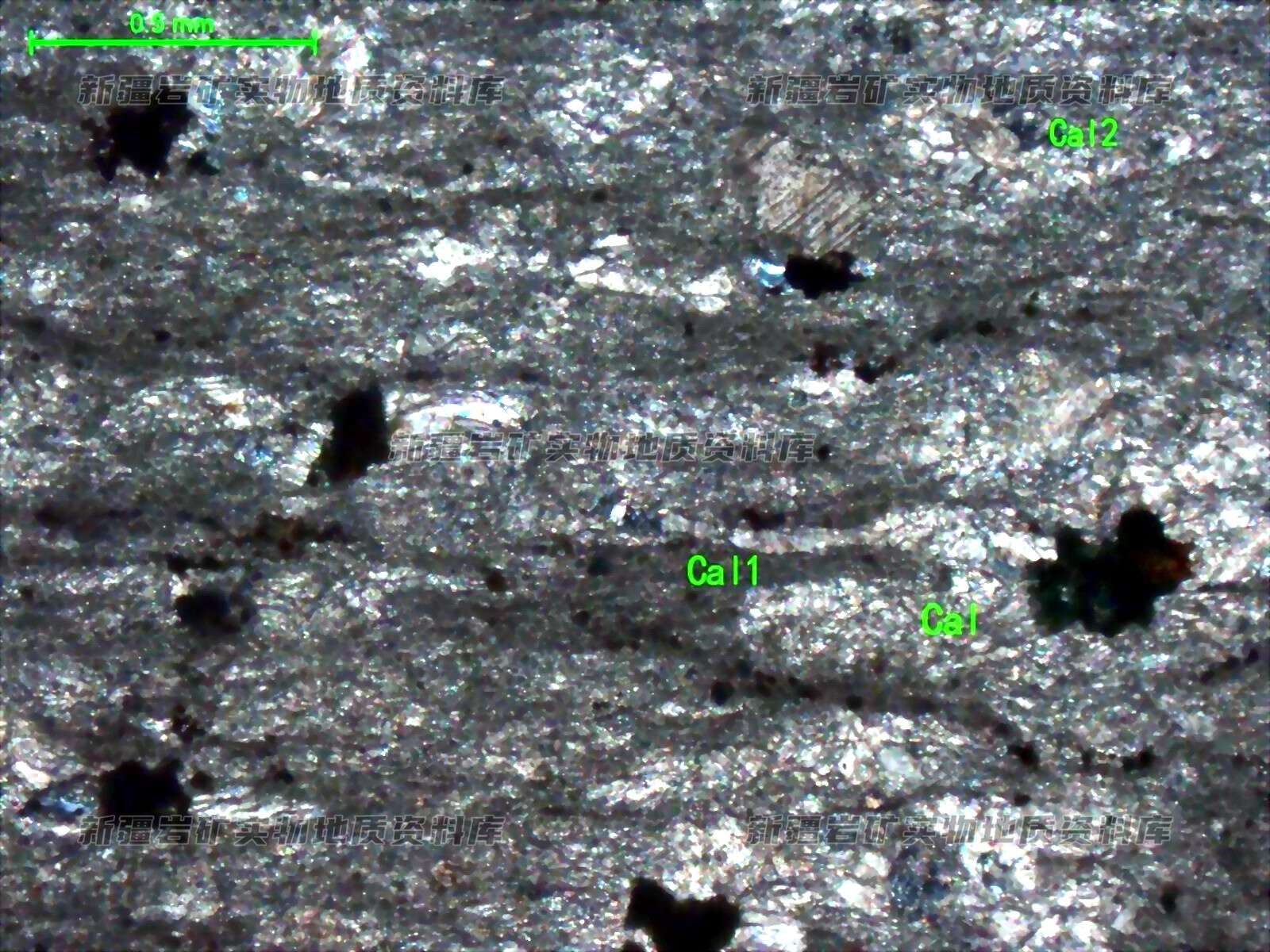岩石特征描述: 岩石中方解石大部分呈细晶状(Cal),少部分呈粉晶状(Cal2),另受应力挤压见少量泥晶方解石(Cal1),均断续呈条带状平行定向分布。岩石由方解石组成,分布少量不透明矿物。