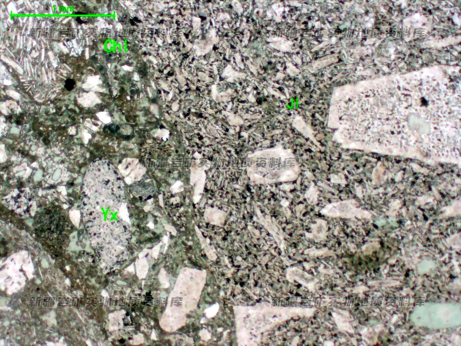 岩石特征描述: 岩石碎屑主要为角砾(Jl),少部分岩屑(Yx),其成分为玄武岩、安山岩,填隙物已蚀变,主要为鳞片状绿泥石(Chl)团块。岩石由碎屑、胶结物组成。碎屑由岩屑组成,岩屑中大部分为角砾碎屑,少部分为凝灰碎屑。岩屑由安山岩、玄武岩组成,两者含量相近,具泥化、轻度绿泥石化。胶结物已蚀变重结晶,由绿泥石为主及少量绿帘石组成。