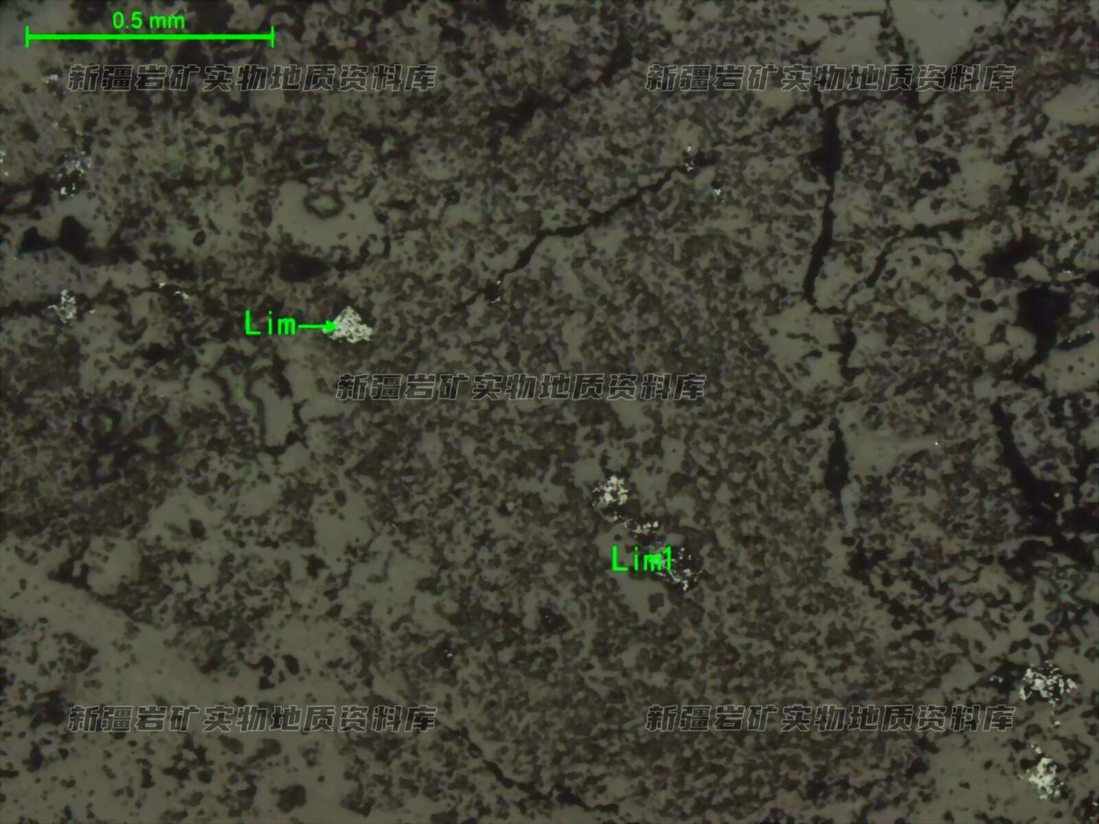 岩石特征描述: 光片中不透明矿物很少,见微量氧化褐铁矿,分布有两种状态,一种呈半自形粒状(Lim),另一种呈微晶集合体(Lim1)透明透明矿物粒间。光片中不透明矿物量很微少,由氧化褐铁矿组成。褐铁矿有两种分布状态,一种呈半自形粒状、散粒状分布;另一种呈微晶集合体状分布透明矿物中或透明矿物之间。