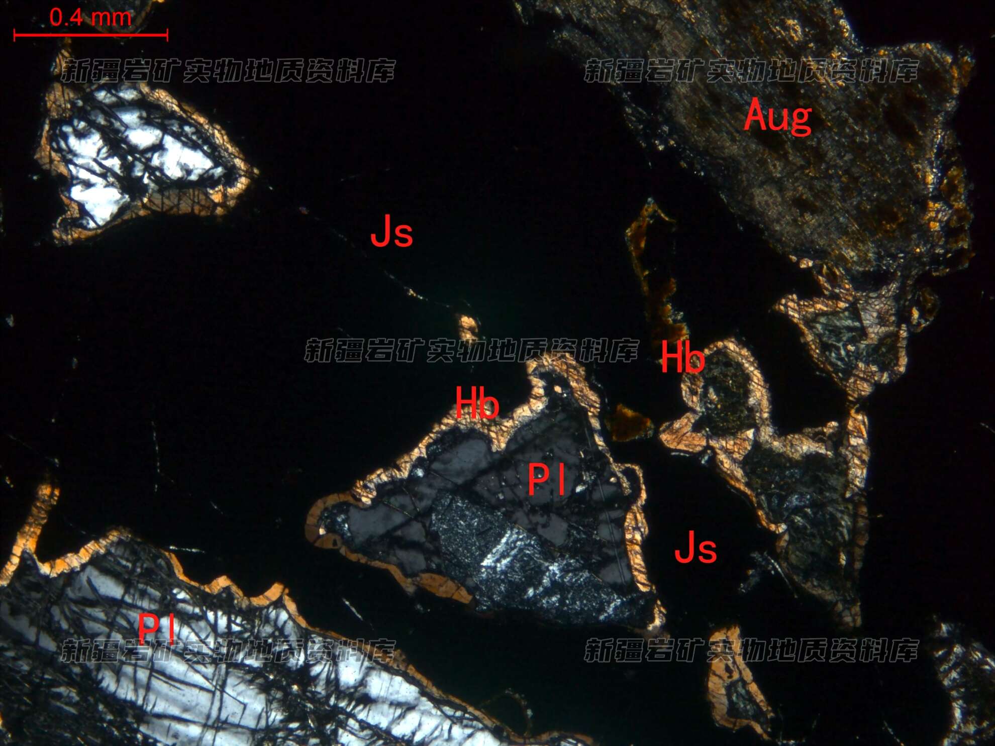 岩石特征描述: 透明矿物为普通辉石(Aug)、斜长石(Pl)和普通角闪石(Hb),角闪石沿辉石和斜长石边缘呈环边状分布。被金属矿物(Js)胶结。岩石主要由透明矿物和金属矿物钛铁矿两部分构成,其中金属矿物含量明显高于透明矿物,透明矿物多数为普通辉石、斜长石及少量角闪石。