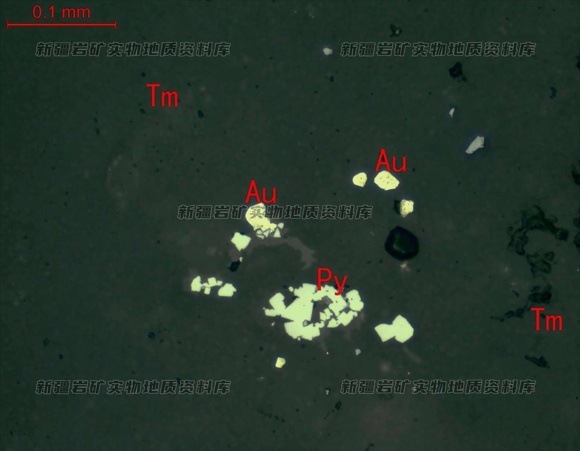 岩石特征描述: 自然金(Au)呈半自形粒状,外形规则,与黄铁矿(Py)共生,分布在透明矿物(Tm)集合体中。