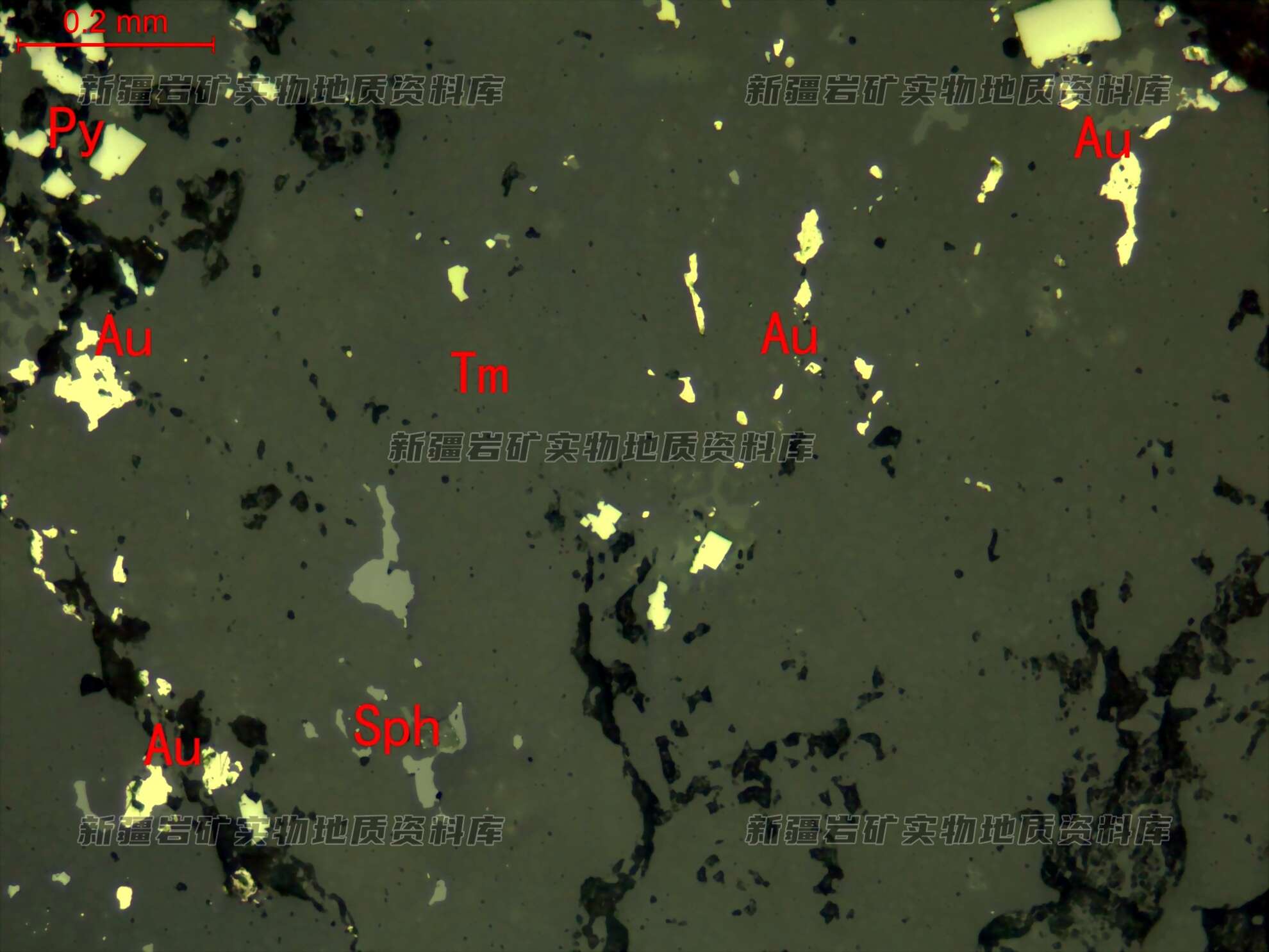 自然金(Au)他形粒状,部分形态不规则状,粒径极细,分布在透明矿物(Tm)粒间。与黄铁矿(Py)、闪锌矿(Sph)共生。