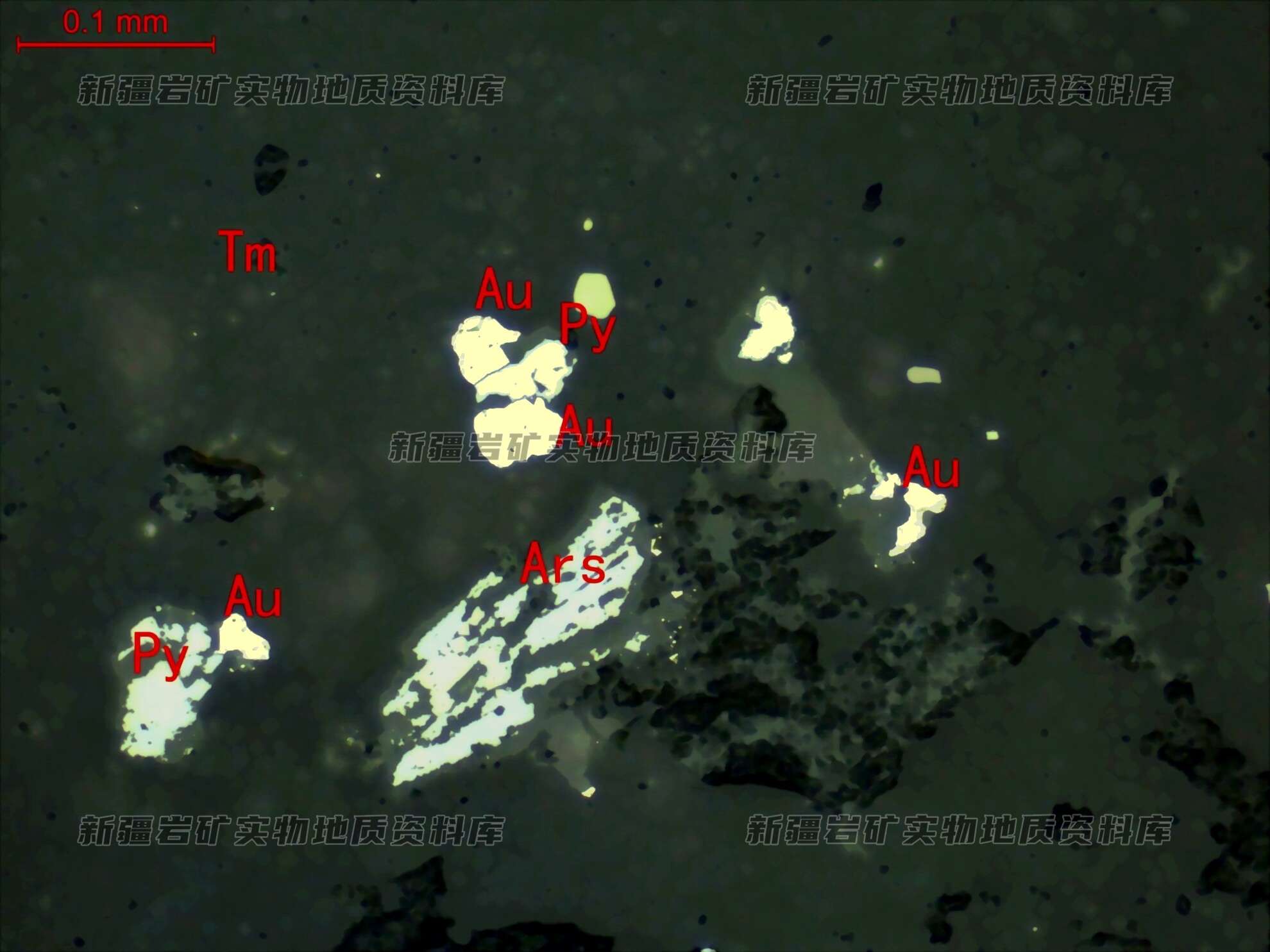 岩石特征描述: 自然金(Au)半自形-他形粒状,粒径极细,分布在透明矿物(Tm)集合体中,与黄铁矿(Py)共生在一起。