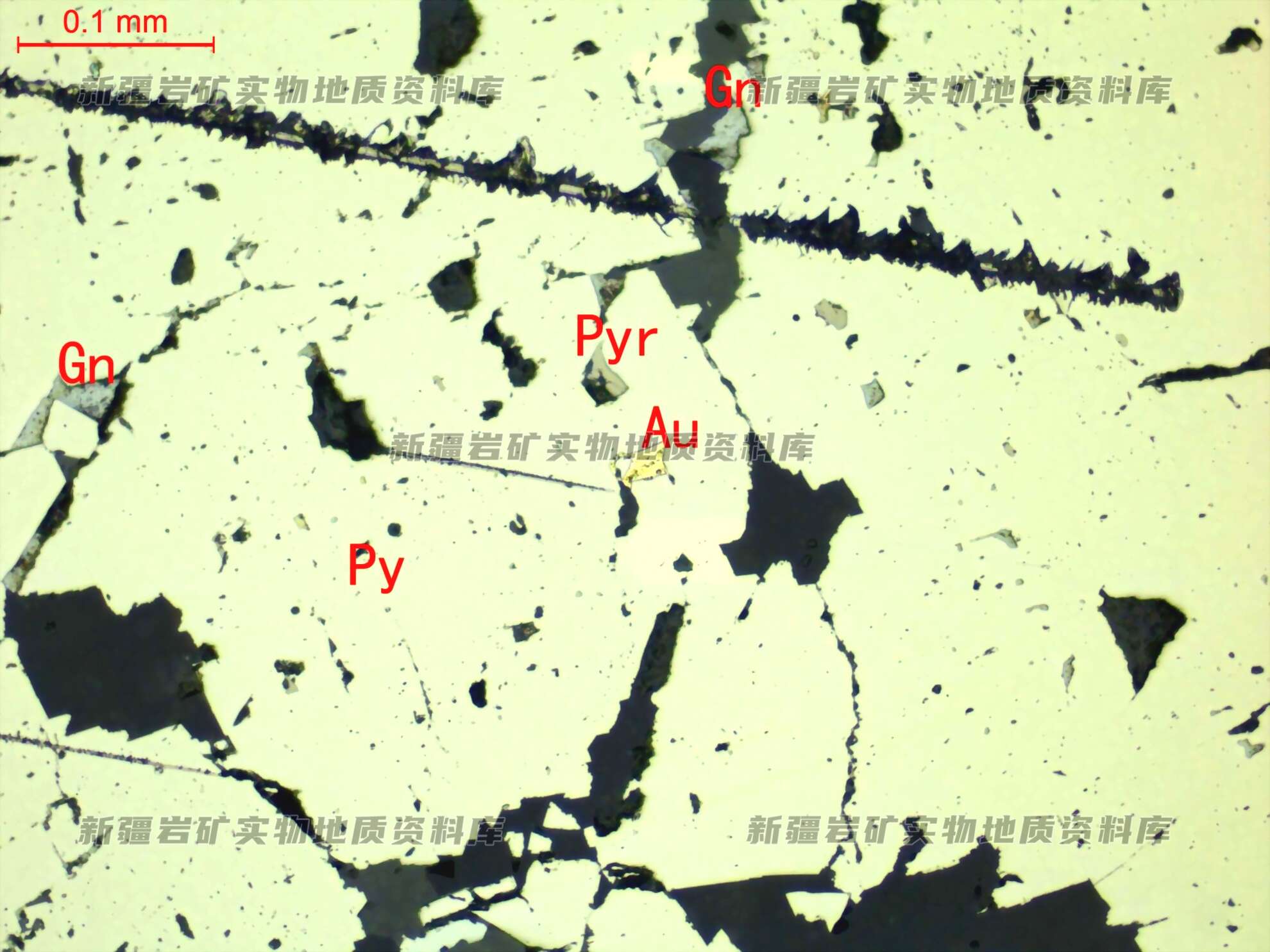 岩石特征描述: 粗粒黄铁矿(Py)中包裹细粒他形粒状自然金(Au),在黄铁矿裂隙中分布方铅矿(Gn)。