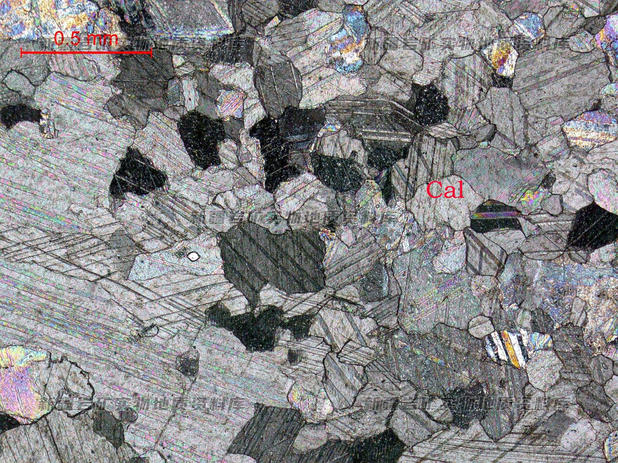 岩石特征描述: 岩石由方解石(Cal)组成,方解石(Cal)呈他形粒状镶嵌分布,但晶粒不均匀,从细晶粒到粗晶粒都有一定量分布,其方解石(Cal)也较干净,少量的方解石(Cal)中分布有微量黑色尘点。岩石局部有压碎作用,方解石(Cal)有细化、粉化,呈不规则条带状分布。