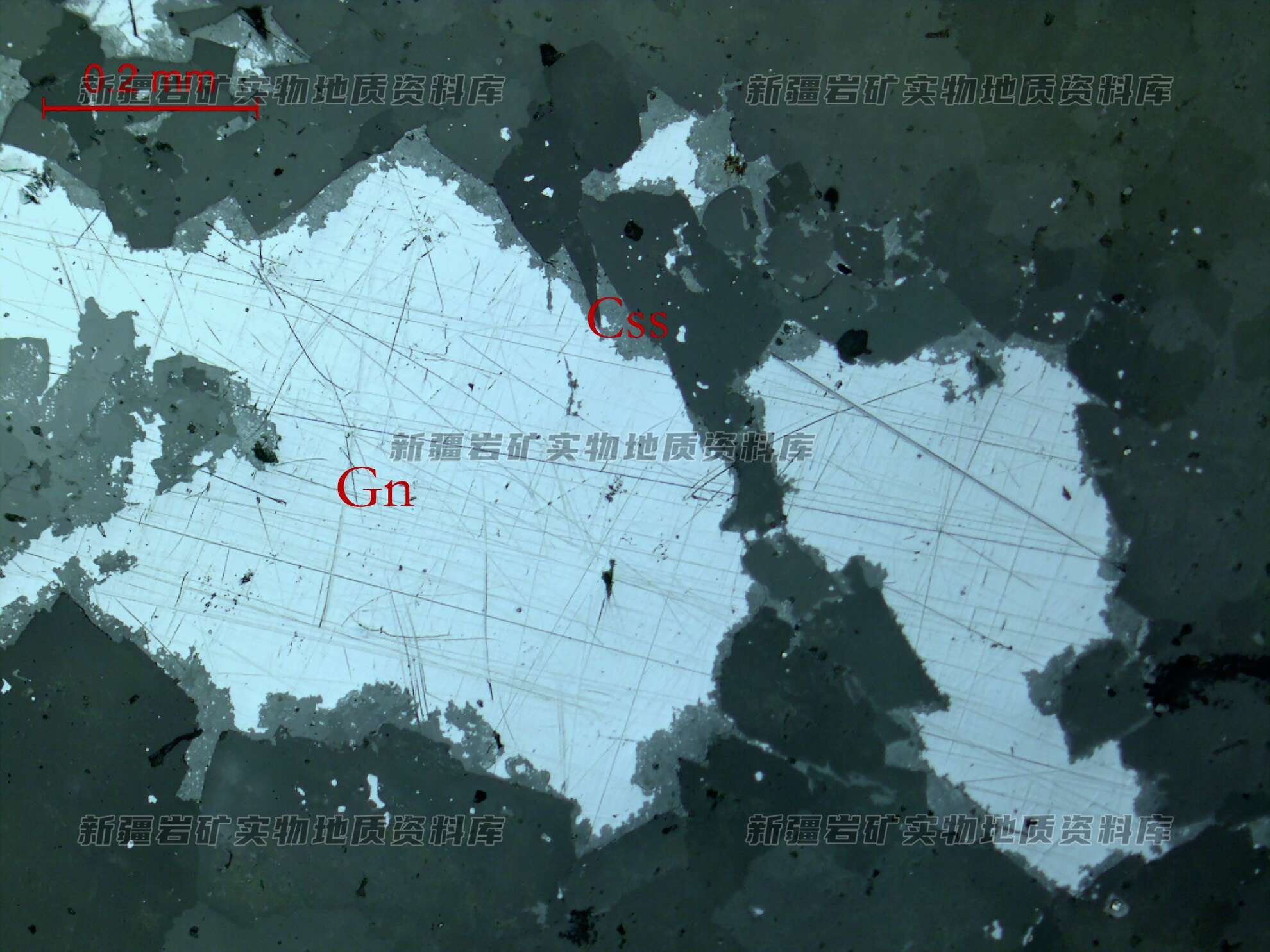 岩石特征描述: 光片中金属矿物主要由方铅矿(Gn)组成,分布少量白铅矿(Css)。方铅矿(Gn)呈他形细粒状、不规则网脉状分布。少量的白铅矿(Css)为方铅矿(Gn)的氧化物,沿边部替代。