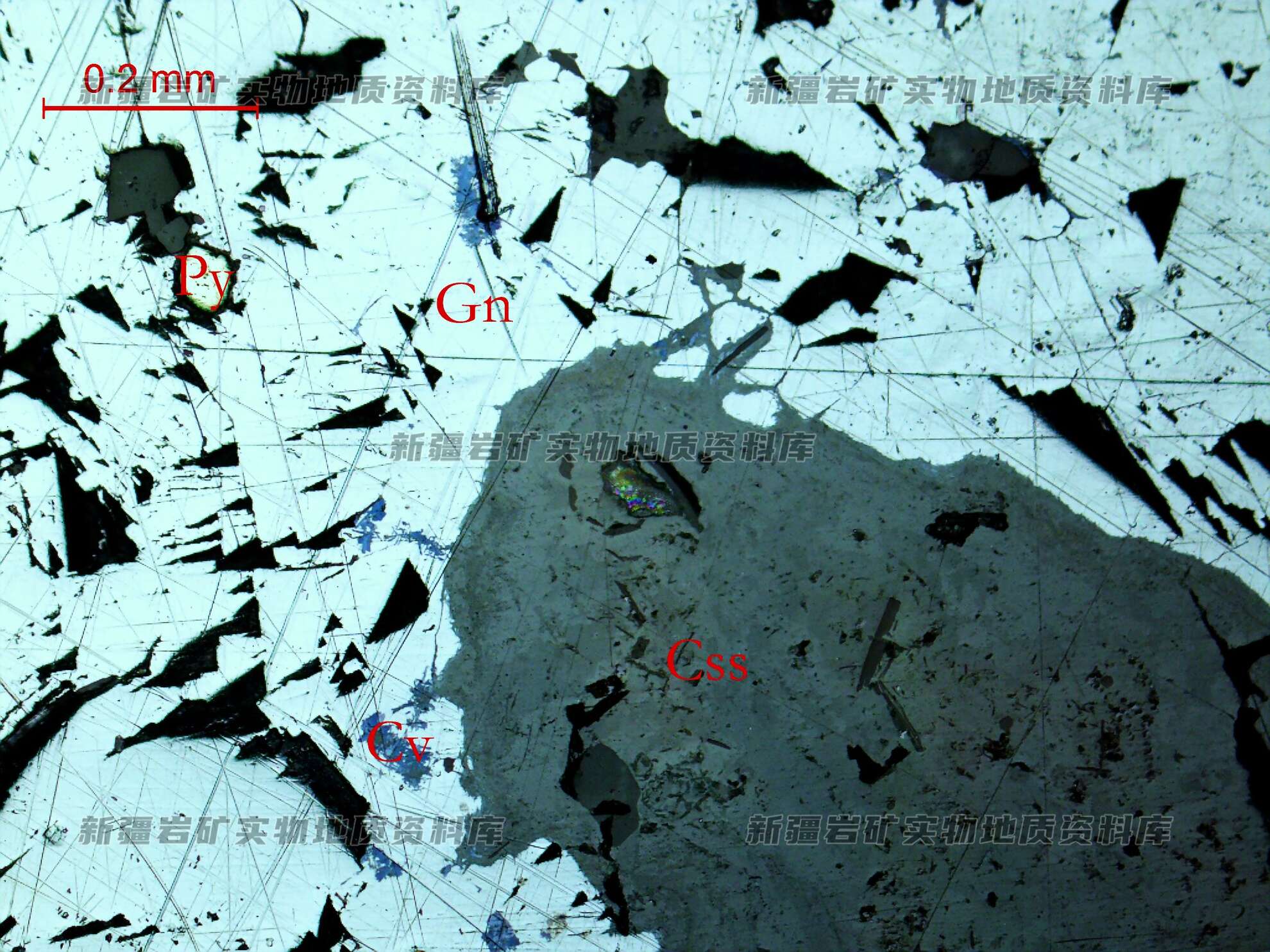 岩石特征描述: 光片中金属矿物含量较高,由方铅矿(Gn)、白铅矿(Css)组成,两者都呈他形粒状、不规则粒状、中等浸染状分布。方铅矿(Gn)多嵌布在白铅矿(Css)中,并在白铅矿(Css)中呈不规则条带状分布,为交代方铅矿(Gn)形成。在局部见有个别黄铁矿(Py),呈浑圆微粒状分布。铜蓝(Cv)有的分布在方铅矿(Gn)和白铅矿(Css)接触界线上,有的充填白铅矿(Css)孔洞状分布。