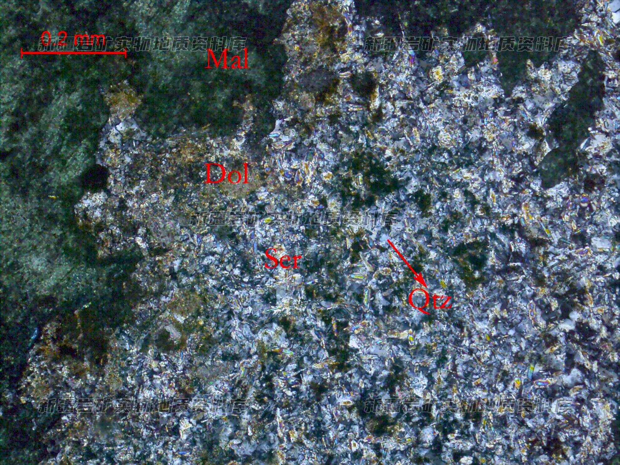 岩石特征描述: 岩石由蚀变重结晶矿物石英(Qzt)、绢云母(Ser)、白云石(Dol)为主组成,分布有少部分孔雀石(Mal)。