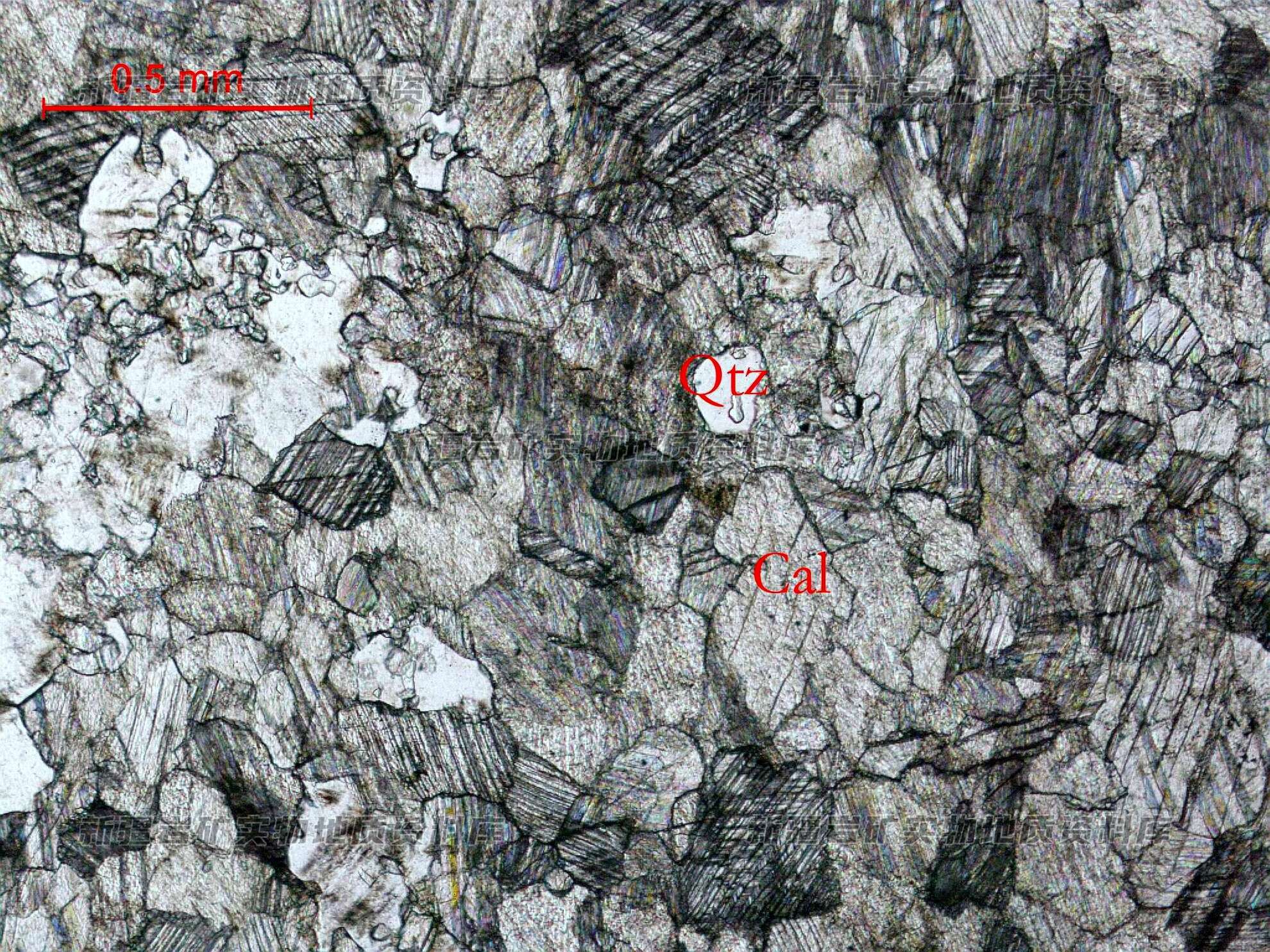 岩石特征描述: 岩石由方解石(Cal)组成,分布少量石英(Qzt)。方解石(Cal)结晶较细,呈他形粒状镶嵌分布,也较脏浊。在方解石(Cal)之间较均匀分布少量他形粒状石英(Qzt),石英(Qzt)为自生形成。