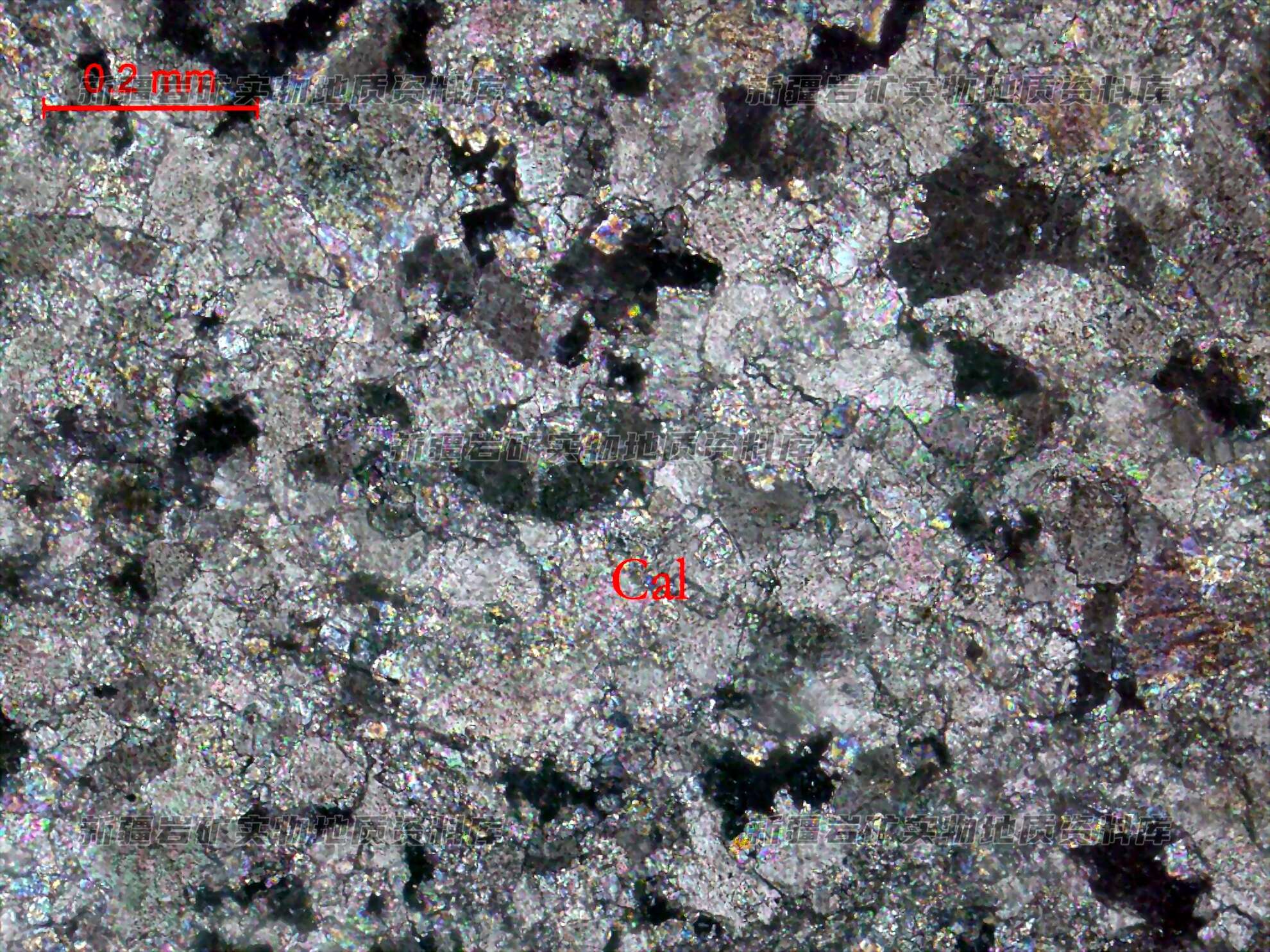 岩石特征描述: 方解石(Cal)都有压碎现象,粒度有细化,少部分的已粉化,粉化方解石(Cal)呈不规则裂隙脉状、网脉状分布。褐铁矿(Lm)呈微晶状多分布在方解石(Cal)中,局部呈缝合线状分布。