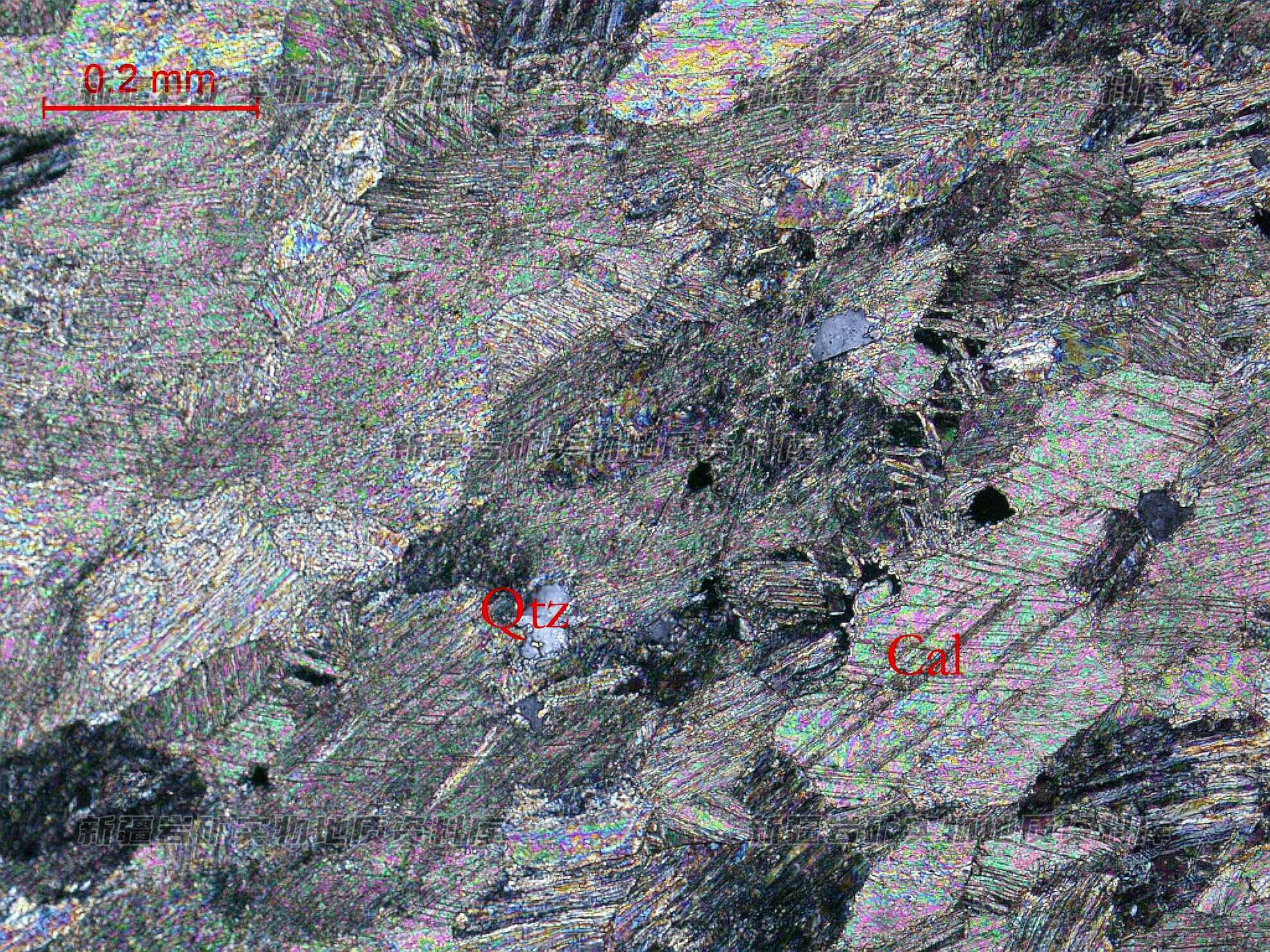 岩石特征描述: 岩石由方解石(Cal)组成,分布少量石英(Qzt)。方解石(Cal)呈他形粒状,有轻度压扁拉长平行定向分布。在方解石(Cal)之间定向散粒状分布他形粒状石英(Qzt)。