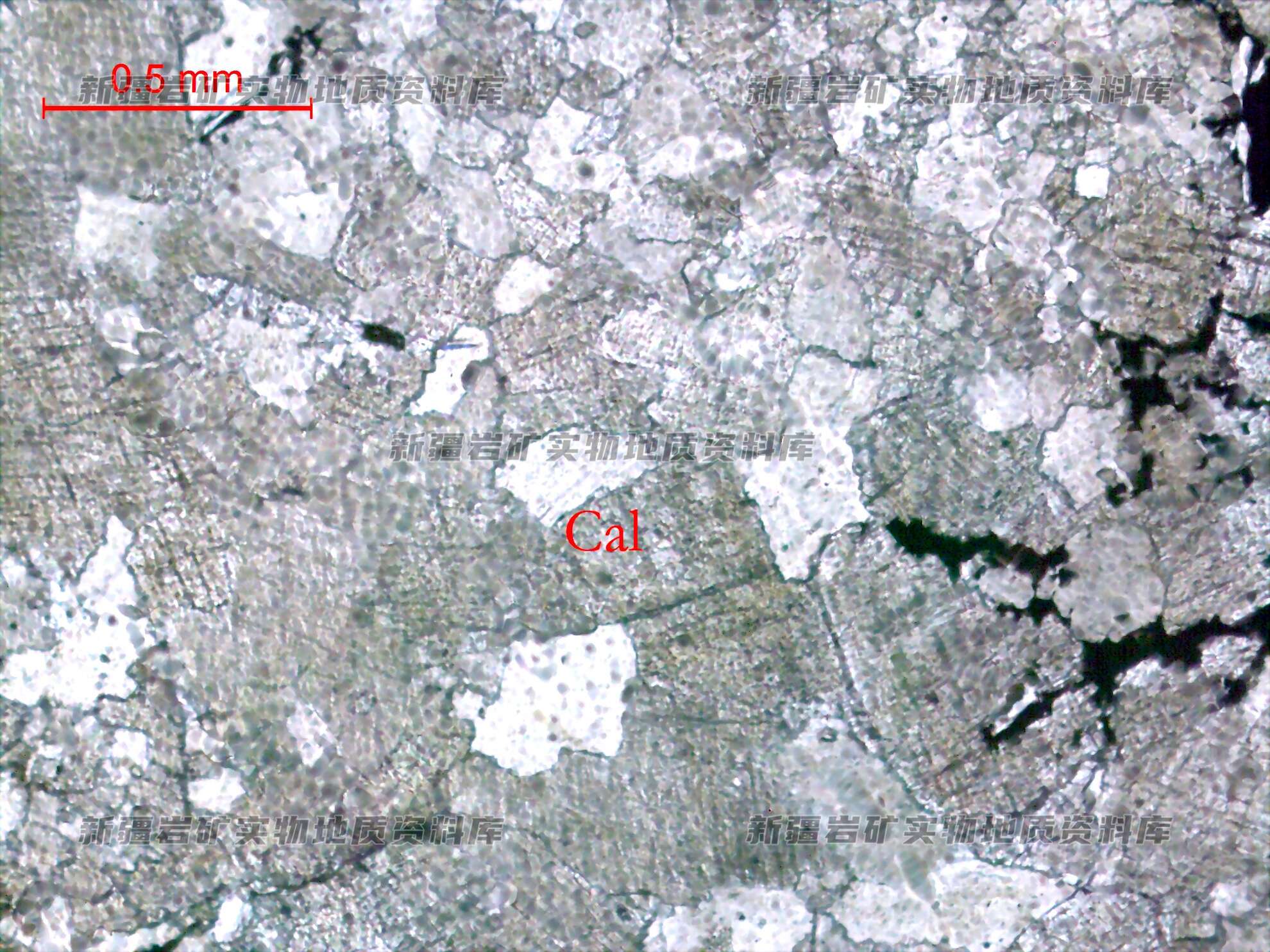 岩石特征描述: 岩石主要由方解石(Cal)组成,方解石(Cal)呈他形等轴粒状镶嵌分布,较干净。分布少部分金属矿物。