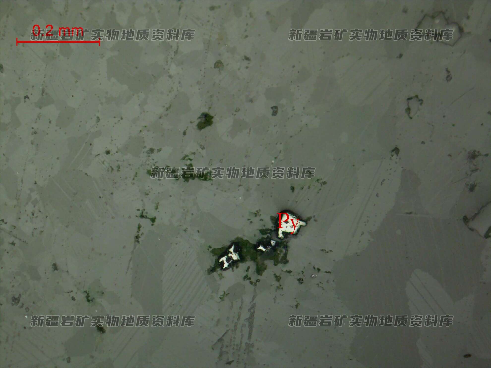 光片中金属矿物为黄铁矿(Py),呈半自形-自形立方体状、散粒状不均匀分布透明矿物之间,个别的有褐铁矿(Lm)化。