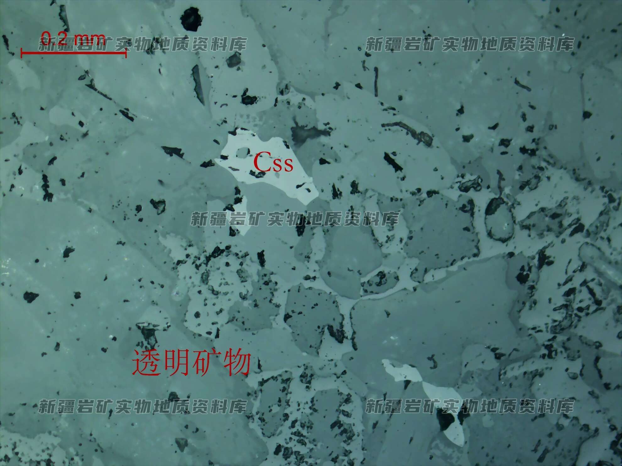 光片中不透明矿物为白铅矿(Css),呈他形板状、散粒状分布透明矿物之间。