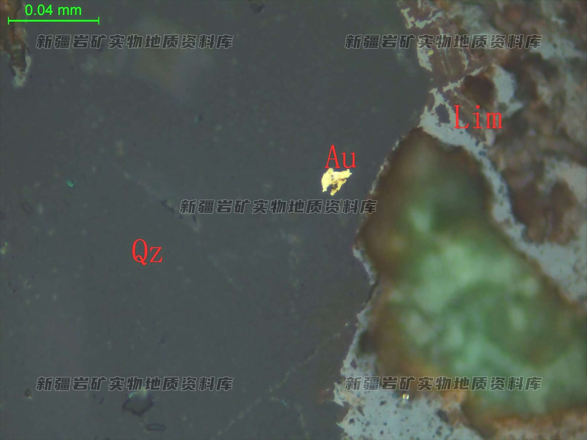 岩石特征描述: 光片在分布的金属矿物量少,仅见少量黄铁矿及自然金,呈星点浸染状分布。 自然金半自形-他形粒状,角粒状,粒径极细,分布于褐铁矿化黄铁矿周围。黄铁矿半自形-自形粒状,粒径细,呈单晶粒或聚粒状分布在透明矿物粒间。多数已被次生褐铁矿取代,呈其假象存在,仅有个别黄铁矿呈残留分布在褐铁矿中。