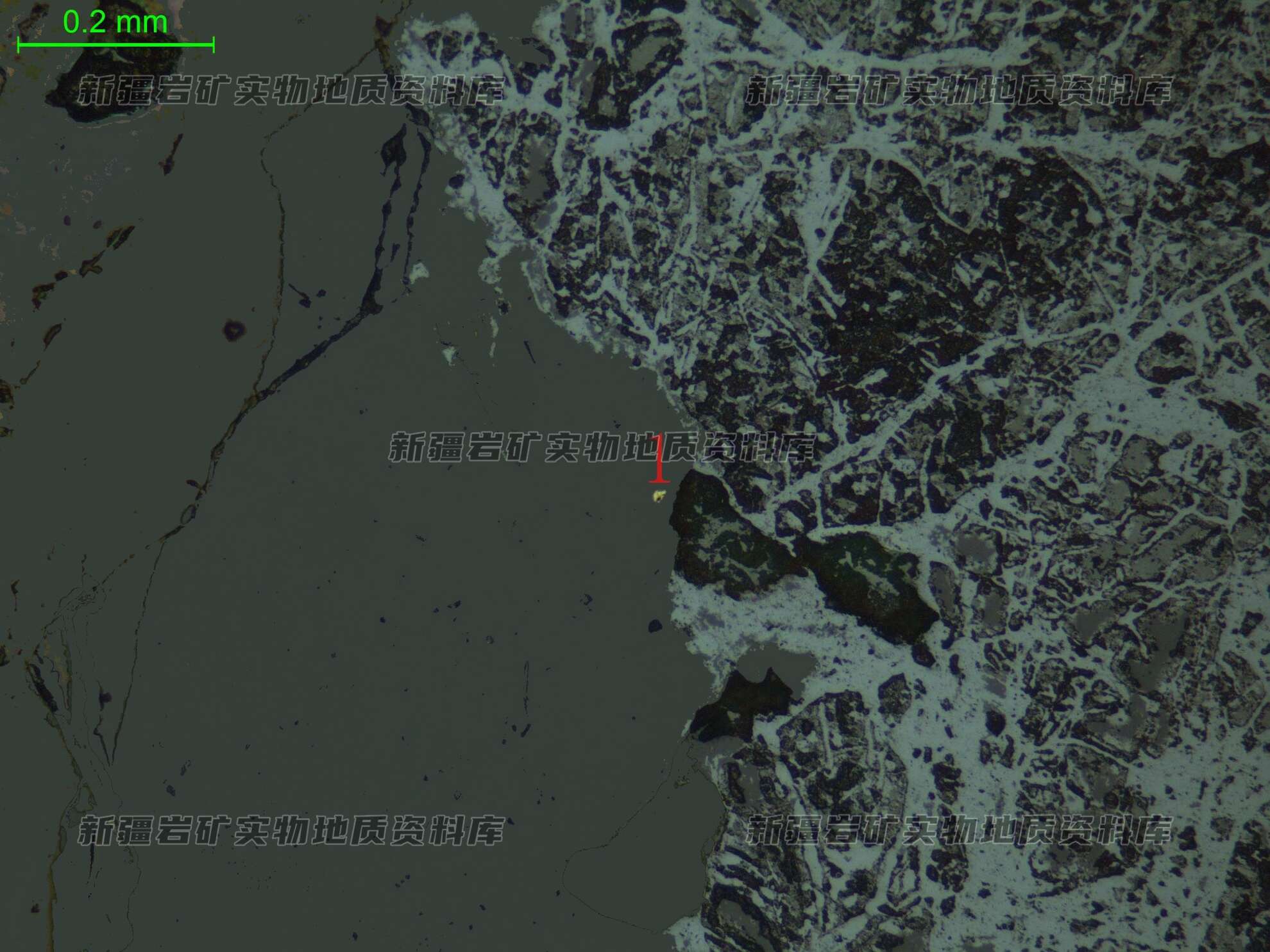 岩石特征描述: 光片在分布的金属矿物量少,仅见少量黄铁矿及自然金,呈星点浸染状分布。 自然金半自形-他形粒状,角粒状,粒径极细,分布于褐铁矿化黄铁矿周围。黄铁矿半自形-自形粒状,粒径细,呈单晶粒或聚粒状分布在透明矿物粒间。多数已被次生褐铁矿取代,呈其假象存在,仅有个别黄铁矿呈残留分布在褐铁矿中。