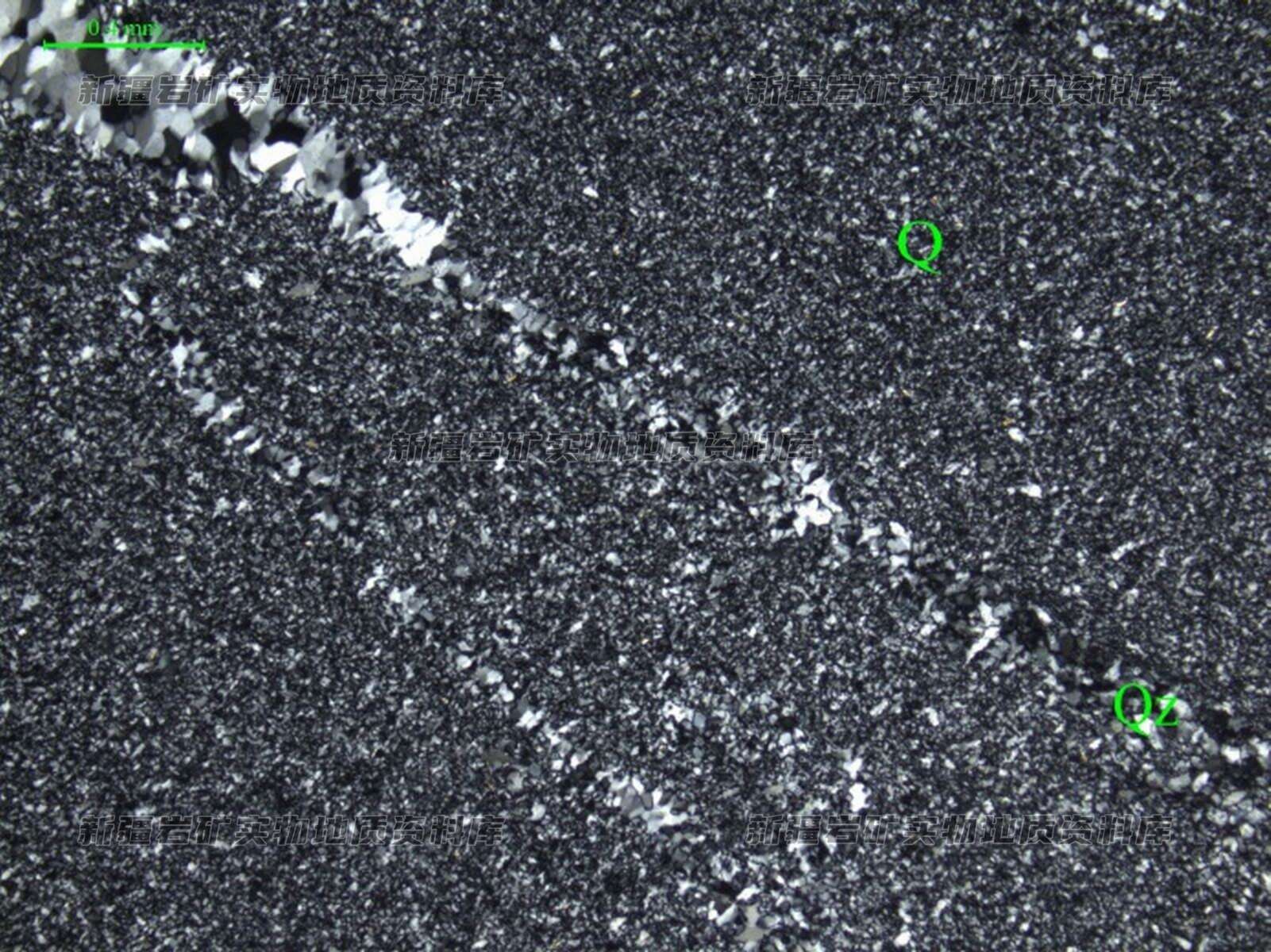 岩石由微小的石英晶粒(Q)组成,具显微粒状变晶结构;可见细粒石英脉(Qz)穿切其中。
