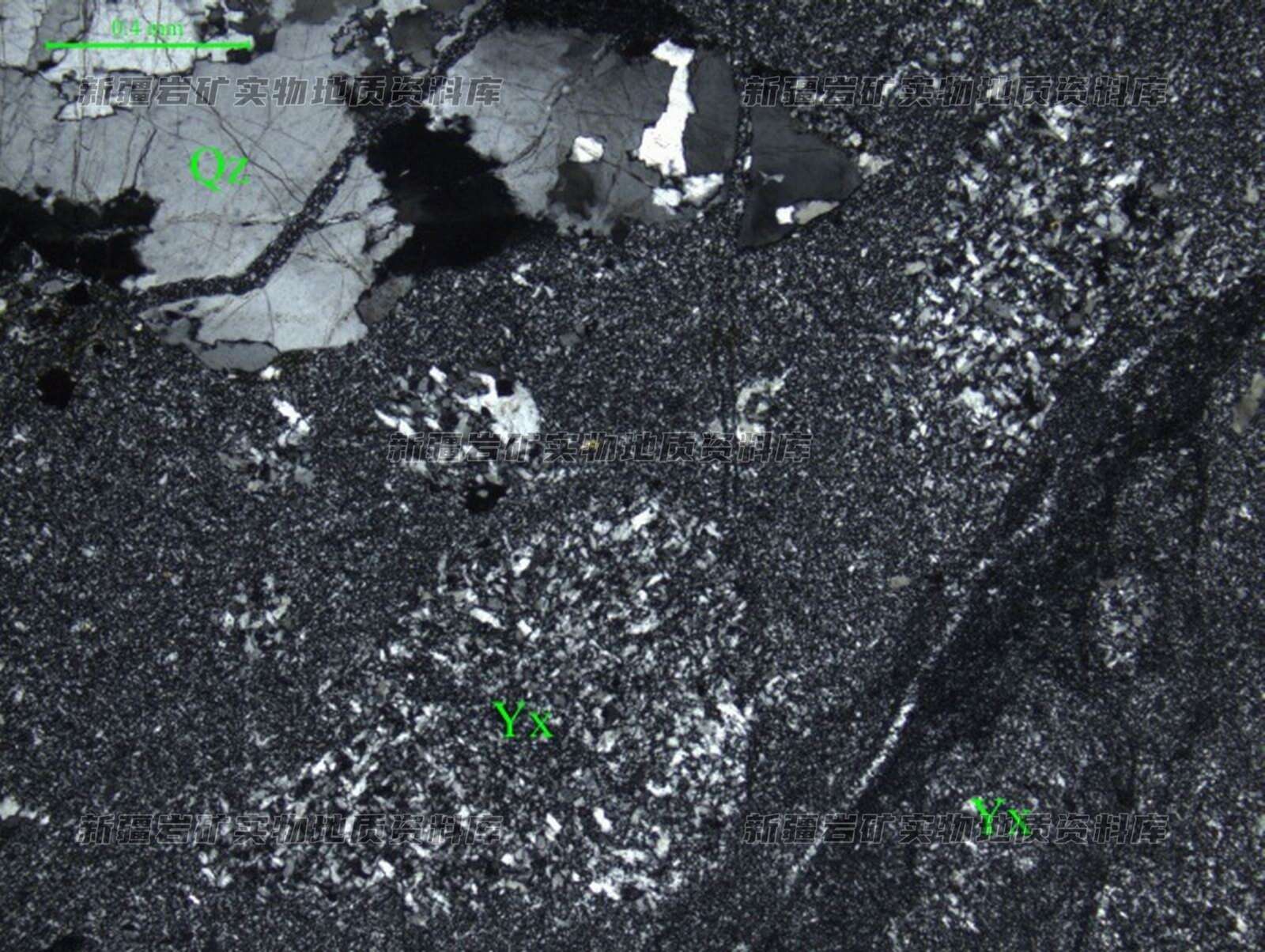 镜下可见不规则棱角状的岩屑(Yx),局部可见残留石英脉团块(Qz)。