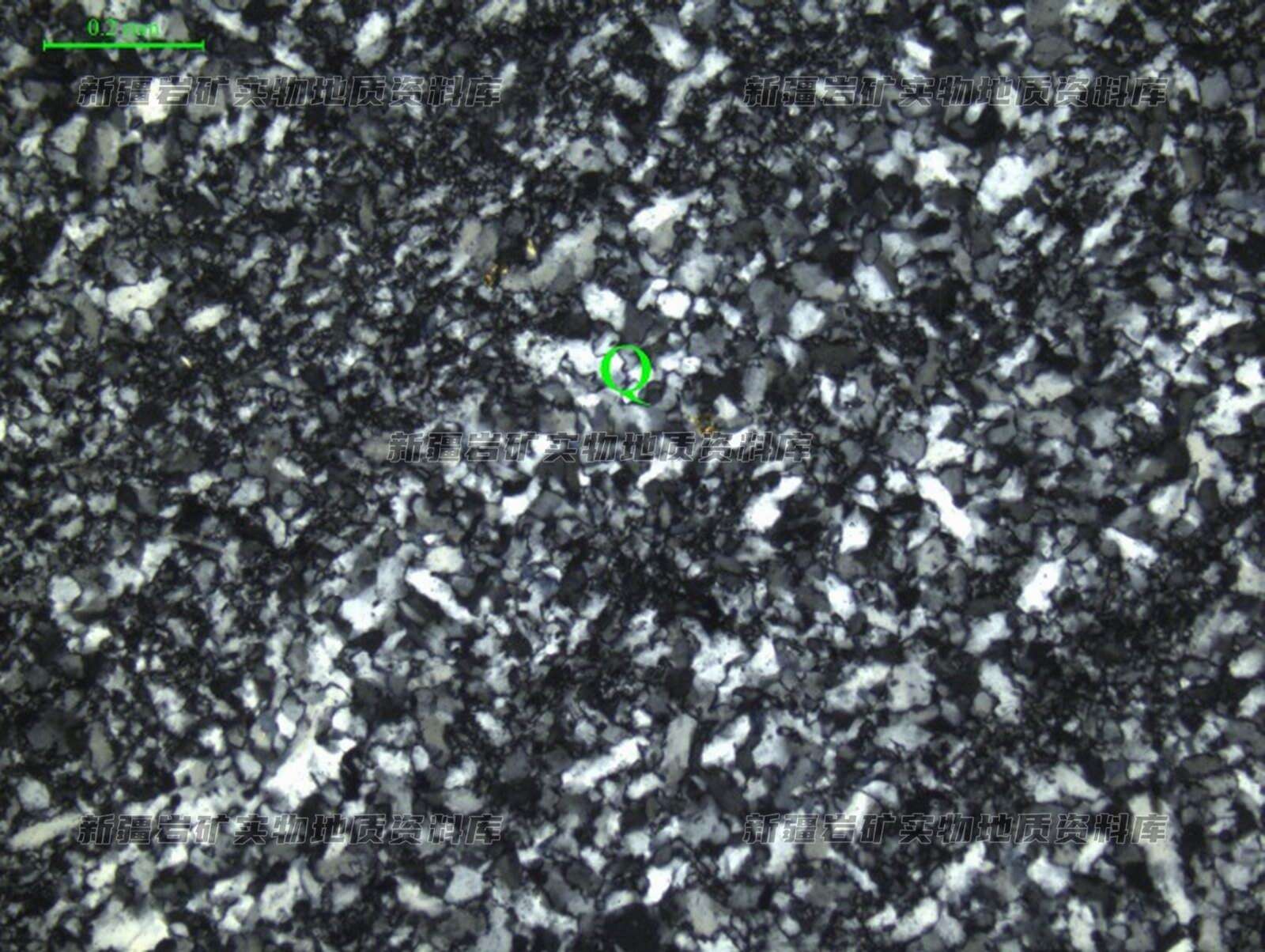 石英晶粒(Q)具细粒变晶结构,呈板条状、他形粒状紧密镶嵌。
