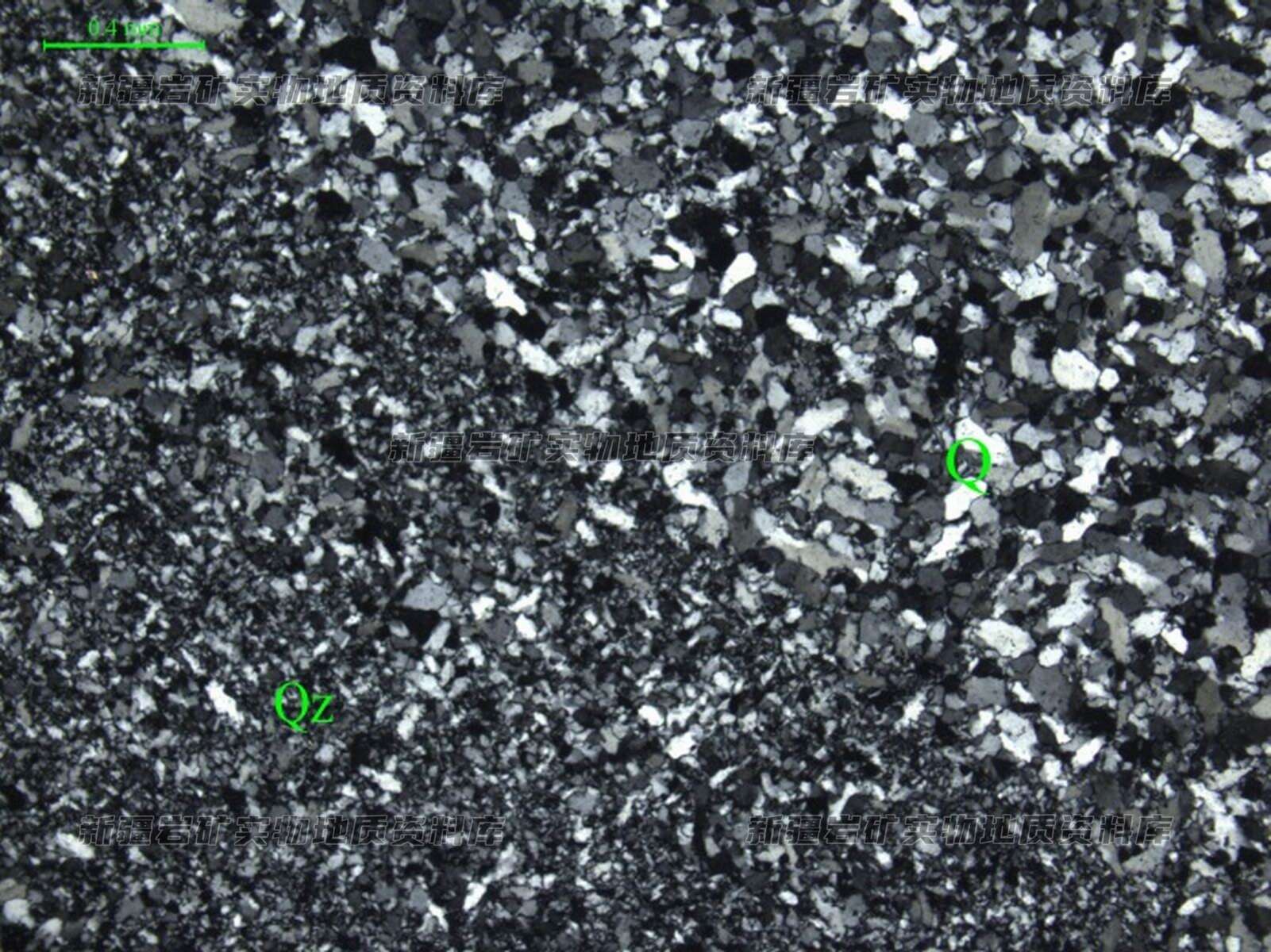 细粒变晶石英(Q)呈板条状、他形粒状紧密镶嵌;显微他形粒状变晶石英(Qz),呈条带状分布在岩石中。