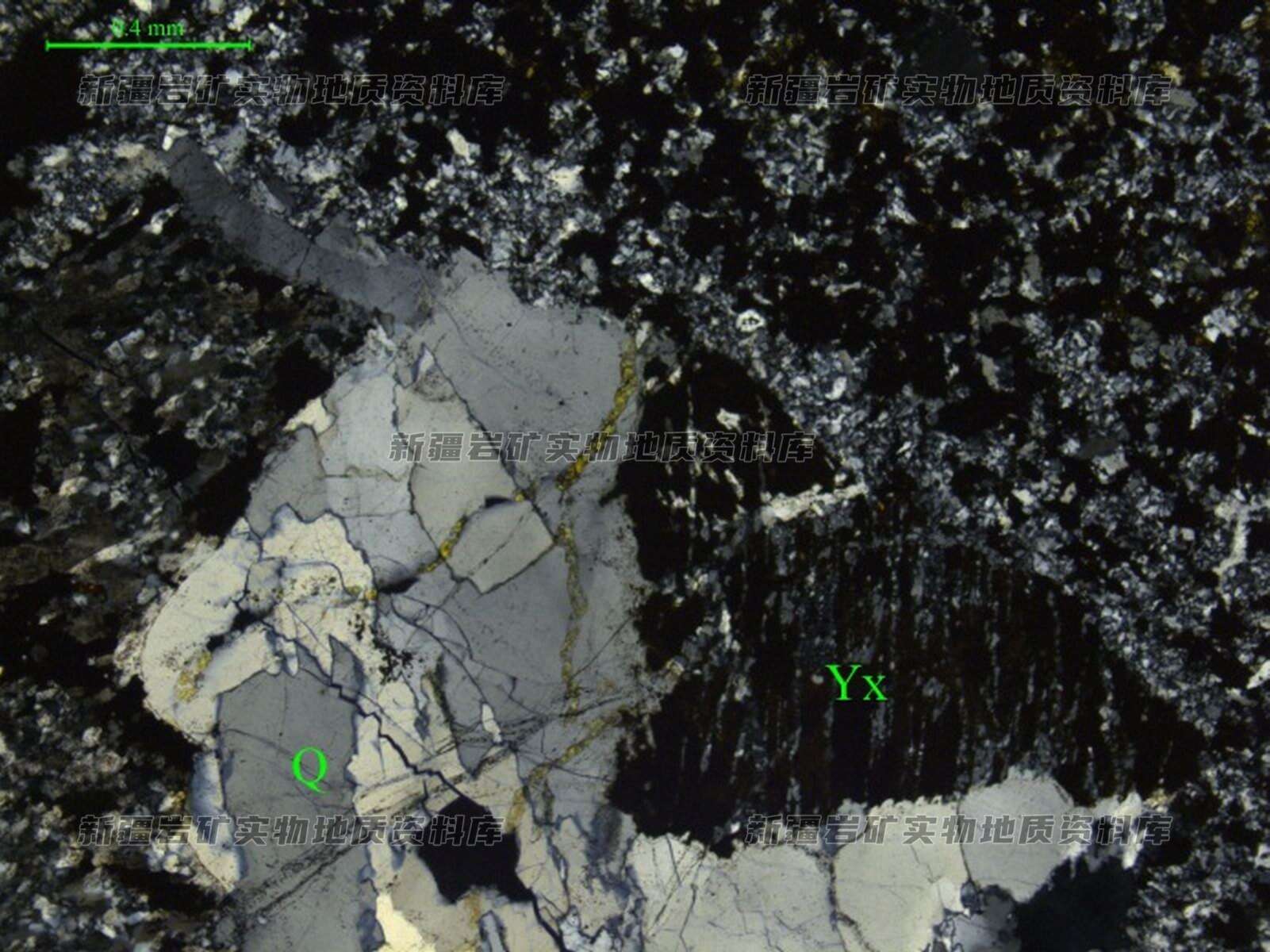 薄片中可见不规则棱角状的岩屑(Yx),局部可见残留石英脉团块(Q)。