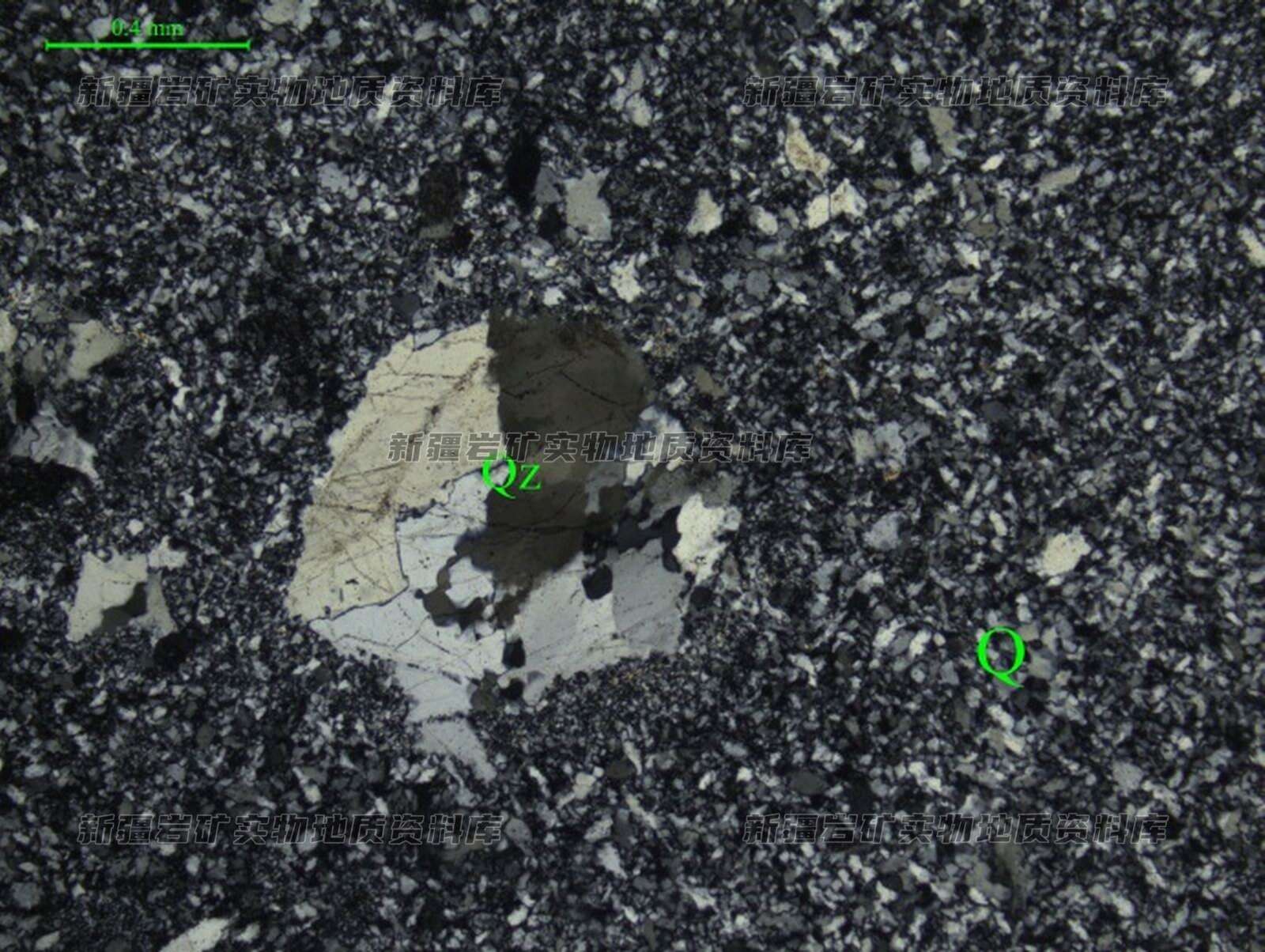 岩石主要由石英晶粒(Q)组成,呈板条状、粒状紧密镶嵌;局部可见残留石英脉团块(Qz)。