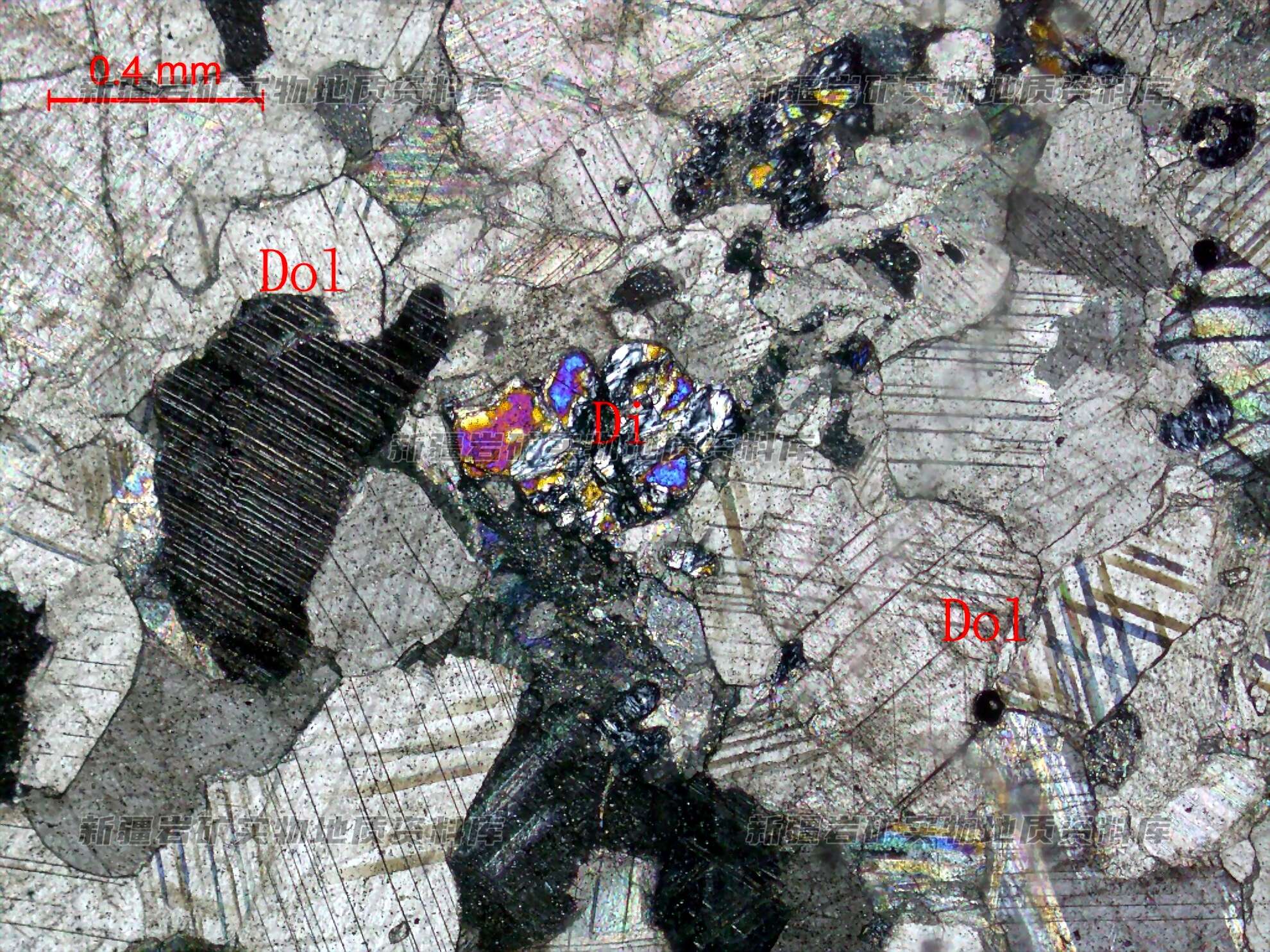 白云石他形粒状,外形较规则,边界平直,粒径多在0.25-0.8㎜之间,彼此呈粒状镶嵌状连生在一起。透辉石他形粒状,粒径细,分布在白云石粒间,部分被次生透闪石及绿泥石等交代。