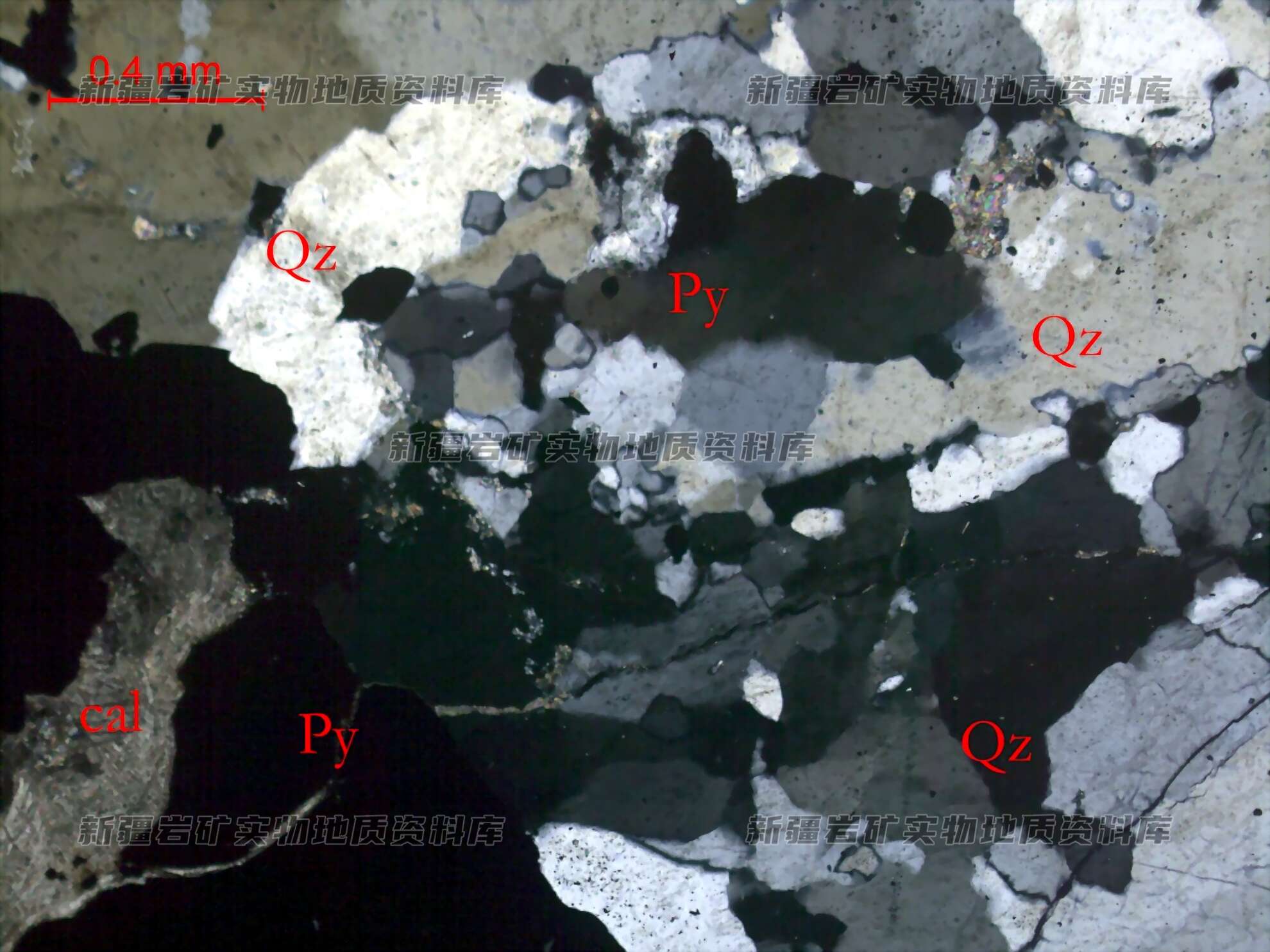 石英他形粒状,粒径相差很大,在0.06-8㎜之间,多>0.5㎜,晶粒较完整,呈粒状集合体分布。绢云母鳞片状集合体,分布在石英粒间。方解石他形粒状,分布在石英或黄铁矿粒间或沿其裂隙分布。