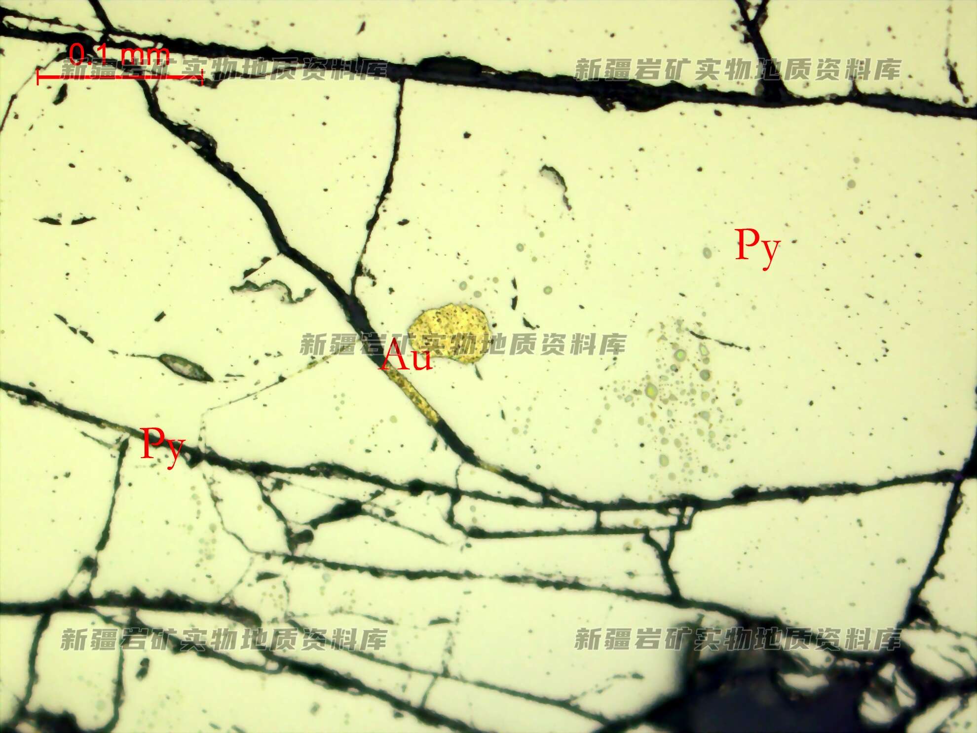 岩石特征描述: 光片中分布的金属矿物绝大多数为黄铁矿,次有微-少量方铅矿、闪锌矿及黄铜矿,镜下见6粒银金矿。