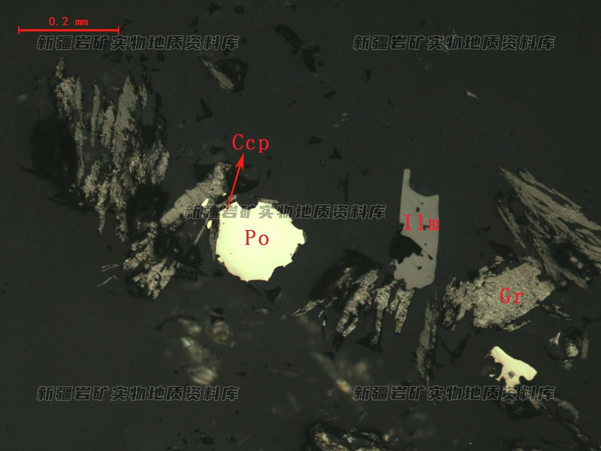 岩石特征描述: 光片中不透明矿物主要由石墨(Gr)、磁黄铁矿(Po)、钛铁矿(Ilm)组成,分布微量黄铜矿(Ccp)。
