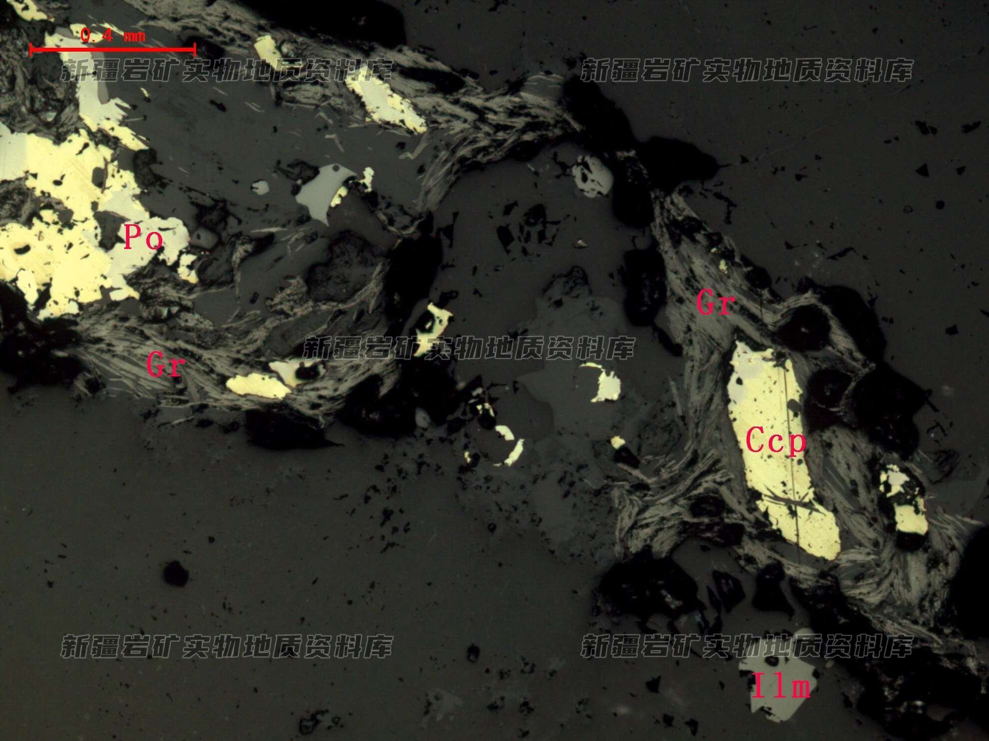 岩石特征描述: 光片中不透明矿物较微少,由磁黄铁矿(Po)、黄铜矿(Ccp)、钛铁矿(Ilm)及石墨(Gr)组成。相对石墨比其他金属矿物略多。