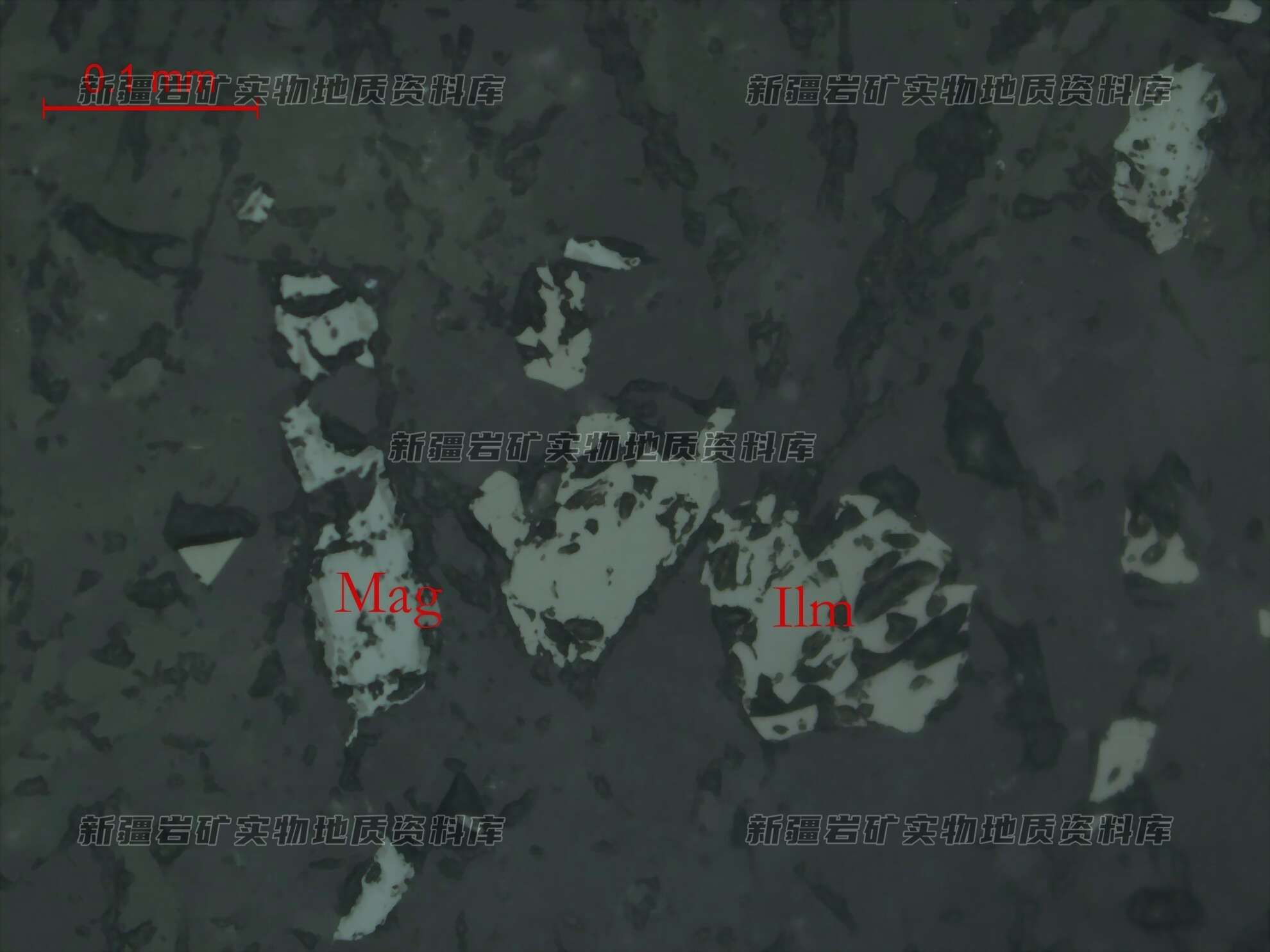 岩石特征描述: 光片中金属矿物主要为钛铁矿,次为磁铁矿,见个别黄铜矿。
