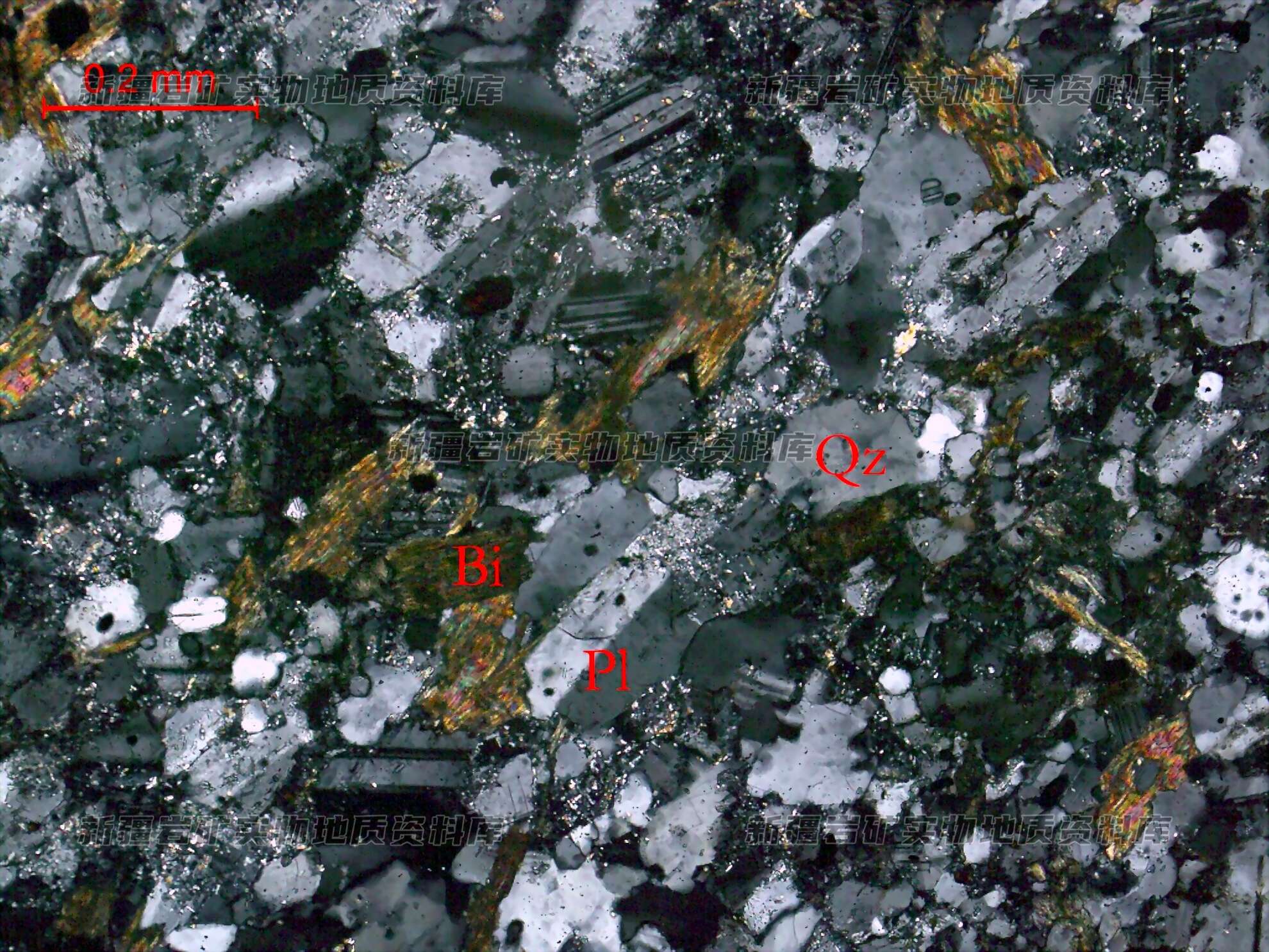 岩石特征描述: 斜长石(Pl)半自形板状,泥化、绢云母化,与他形粒状石英(Qz)相间分布;黑云母(Bi)片状,分布于石英、斜长石间。岩石碎裂,碎裂隙由微细粒石英充填。岩石中主要矿物为石英和斜长石,次为黑云母,见石榴石和少量金属矿物。