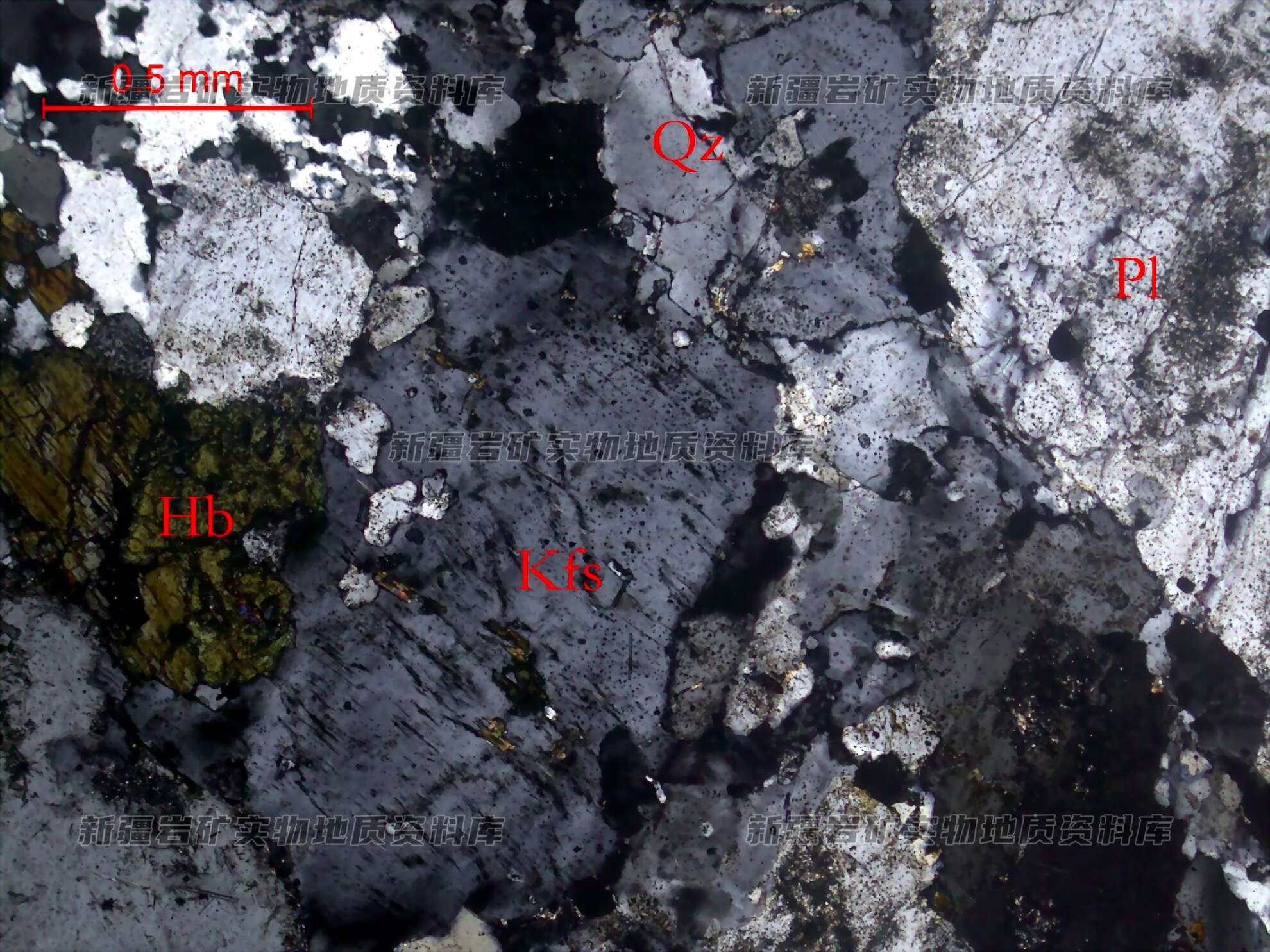 岩石特征描述: 岩石中主要矿物为斜长石(Pl)、石英(Qz)和钾长石(Kfs),次为角闪石(Hb),其中斜长石、石英和钾长石相间分布。岩石中主要矿物为斜长石、石英和钾长石,次为角闪石,见黑云母、微量磷灰石和少量金属矿物。