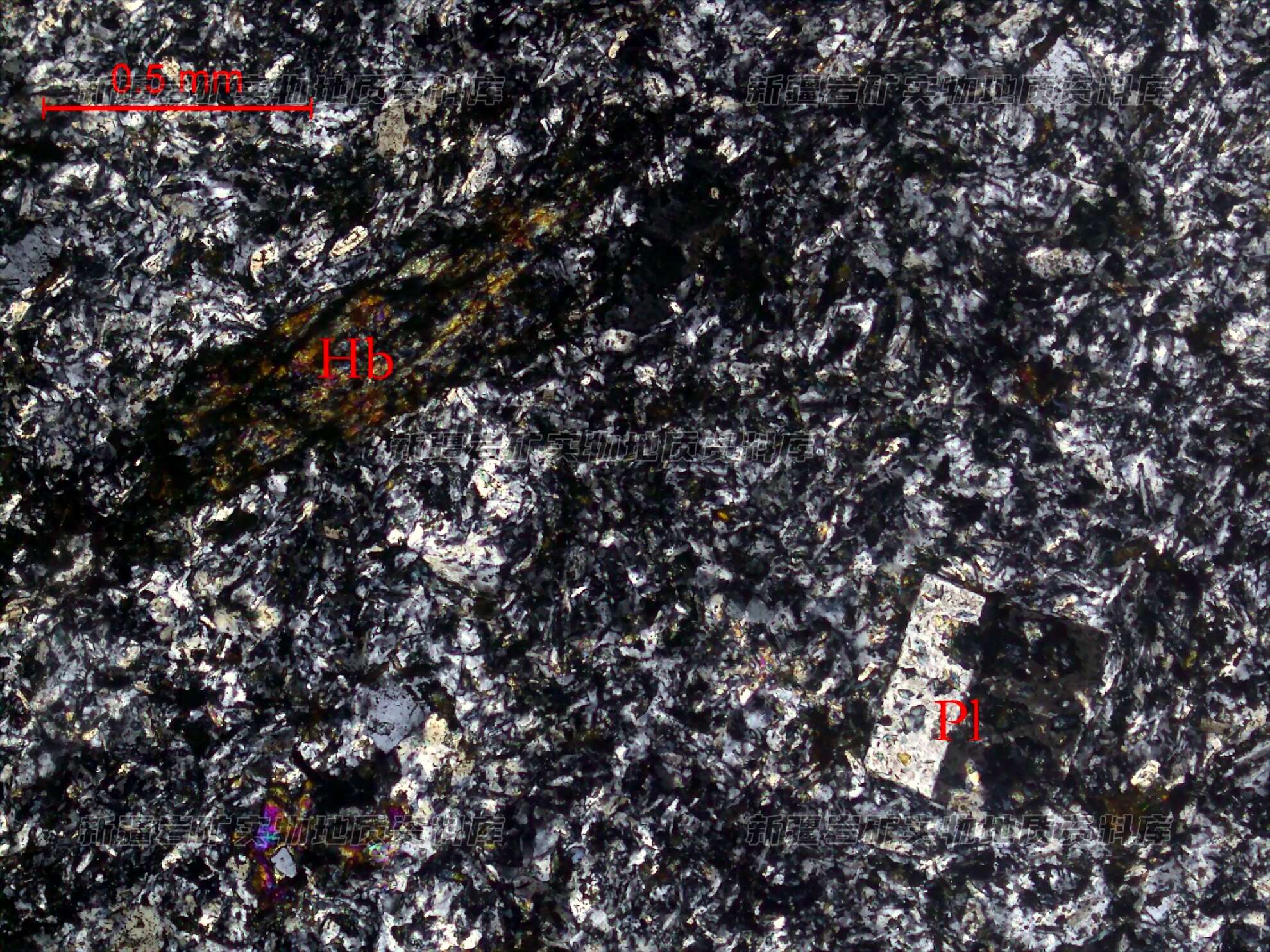 岩石特征描述: 斜长石(Pl)斑晶半自形板状,泥化、绢云母化、帘石化,见简单双晶;角闪石(Hb)斑晶半自形柱状,绿泥石化、绿帘石化,已被蚀变矿物绿泥石、绿帘石集合体取代,保留其外形。岩石具斑状结构,斑晶为斜长石、角闪石,基质由斜长石、绿泥石等组成。