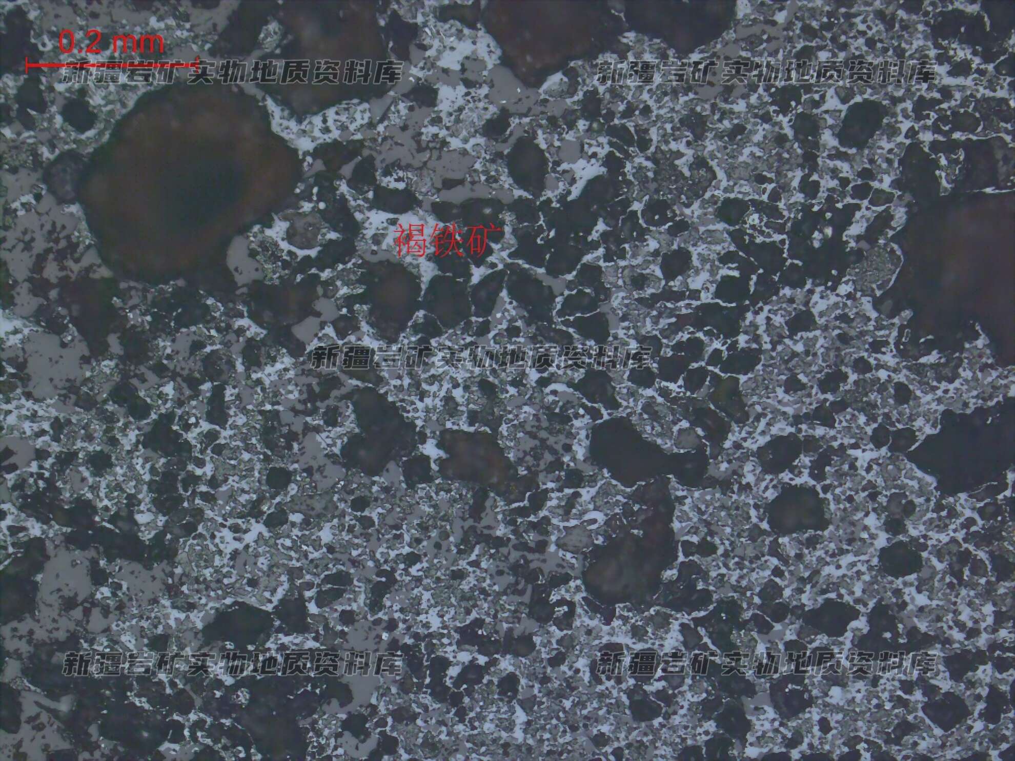 褐铁矿微晶粒中等浸染状分布,个别褐铁矿呈他形细粒状分布透明矿物间。
