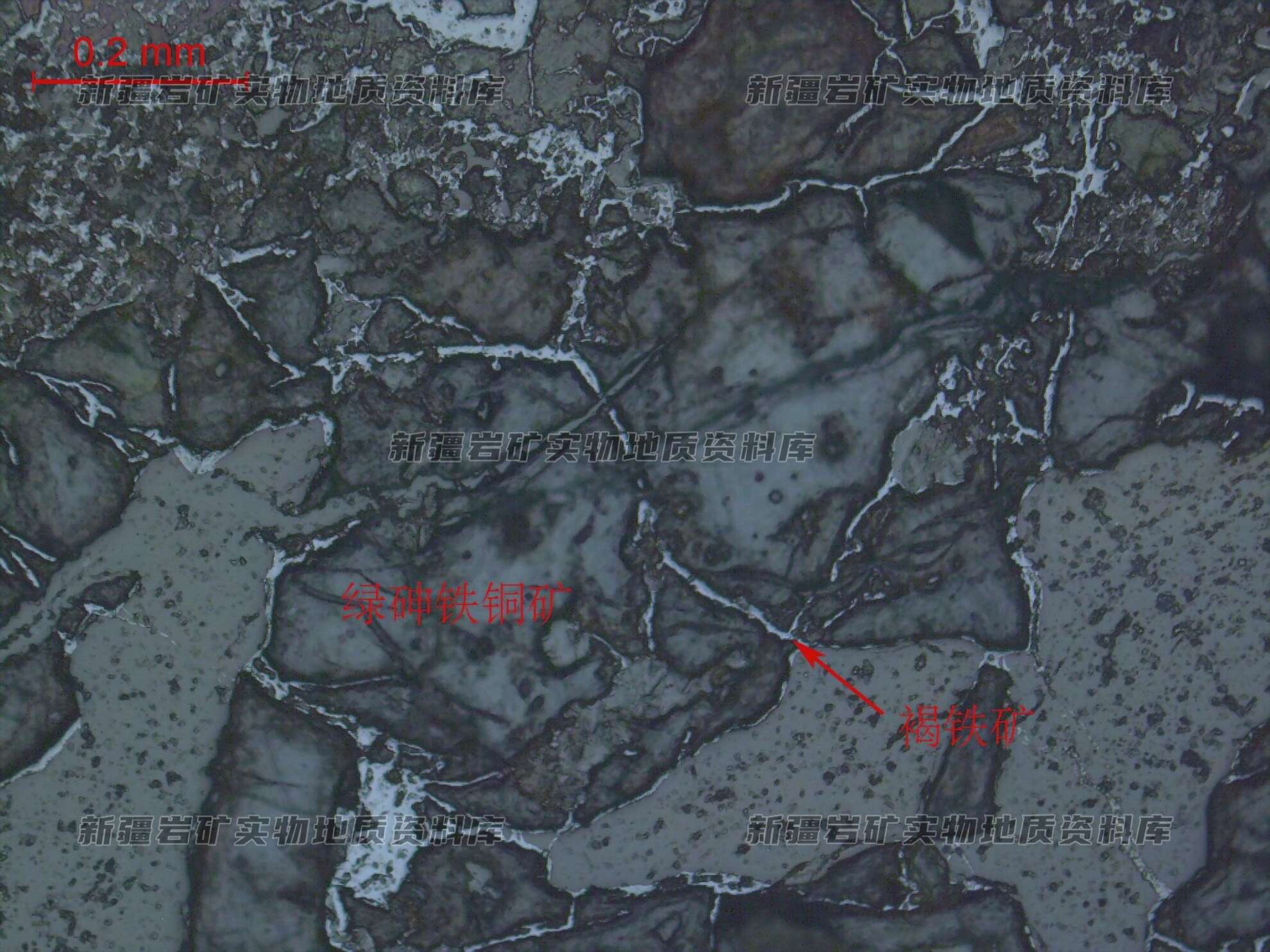 绿砷铁铜矿?他形粒状,在其粒间分布褐铁矿。