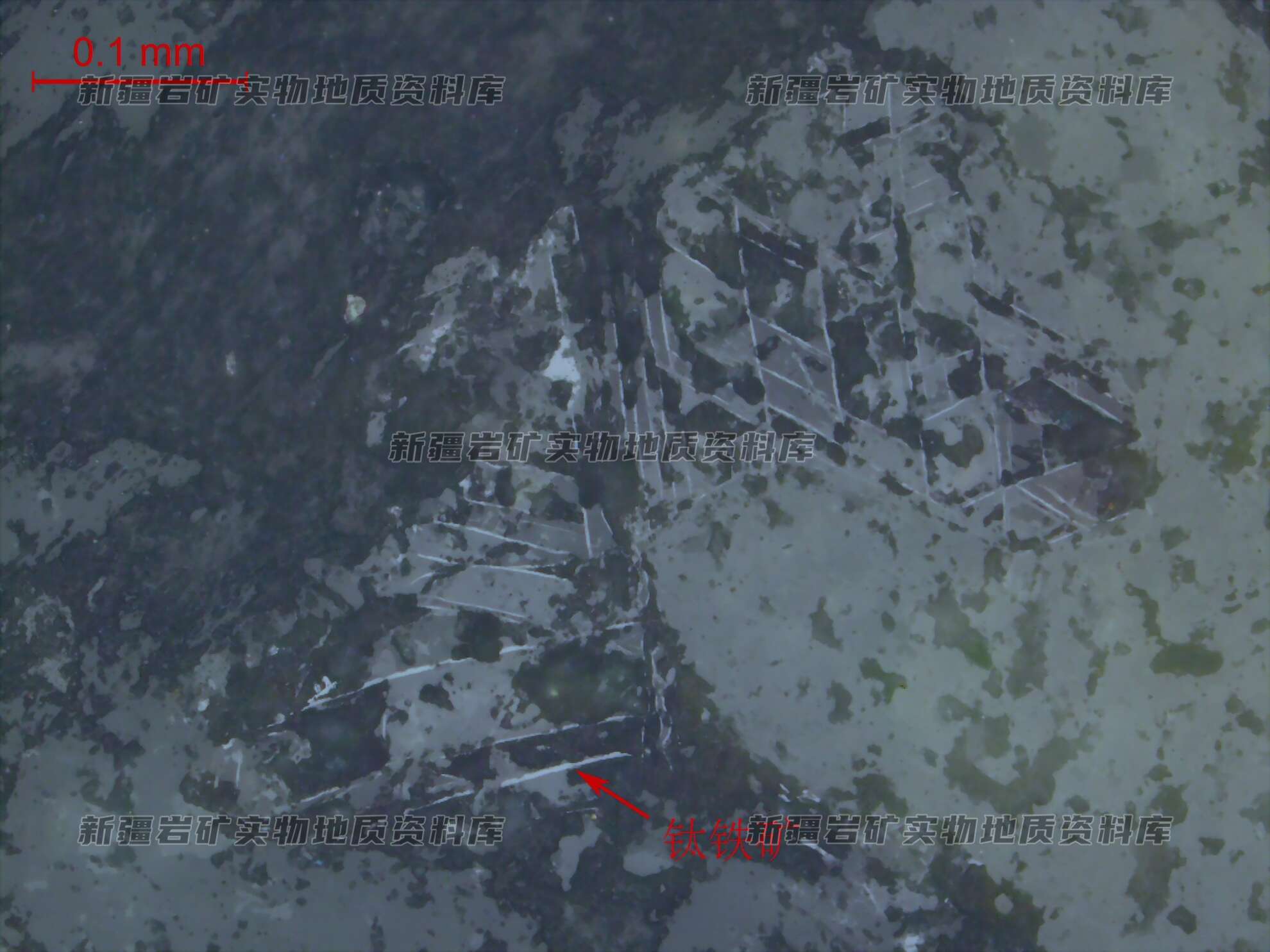 钛铁矿沿暗色矿物解理分布,具较强白钛石化。