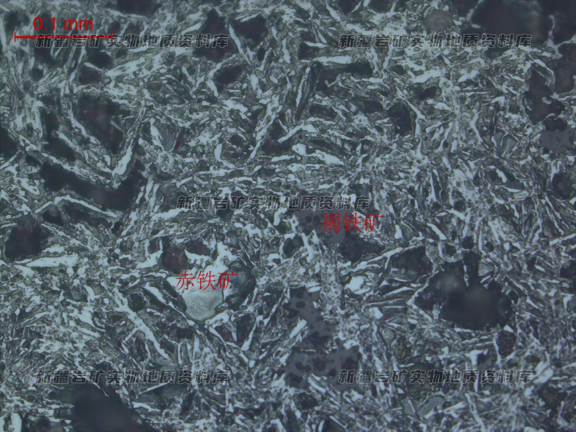 赤铁矿微板状小集合体,中等浸染状分布,多分布在褐铁矿中。