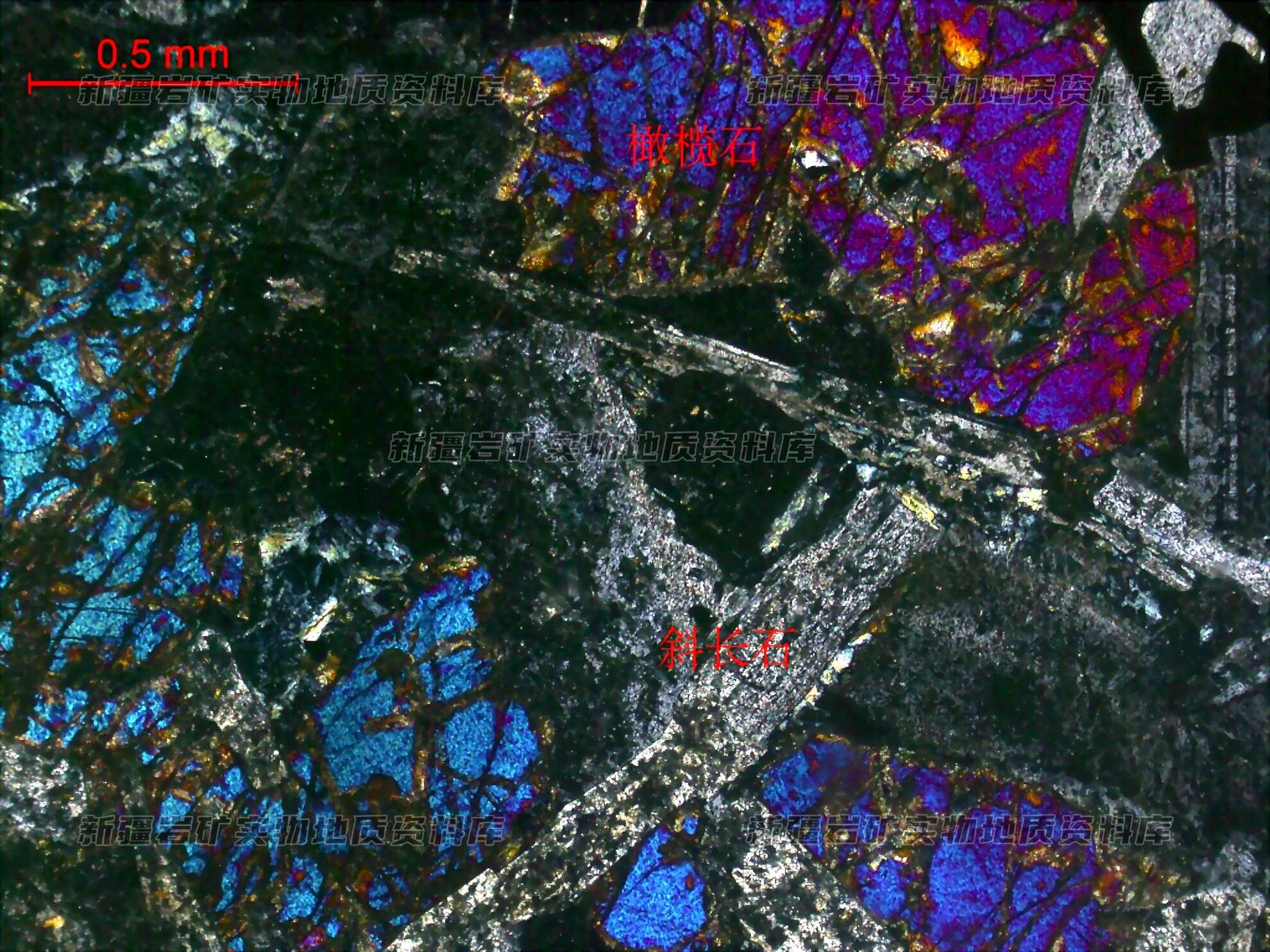 斜长石自形细长板条状,强泥化、轻-中度帘石化;橄榄石半自形-自形粒状、柱状,分布在斜长石间。