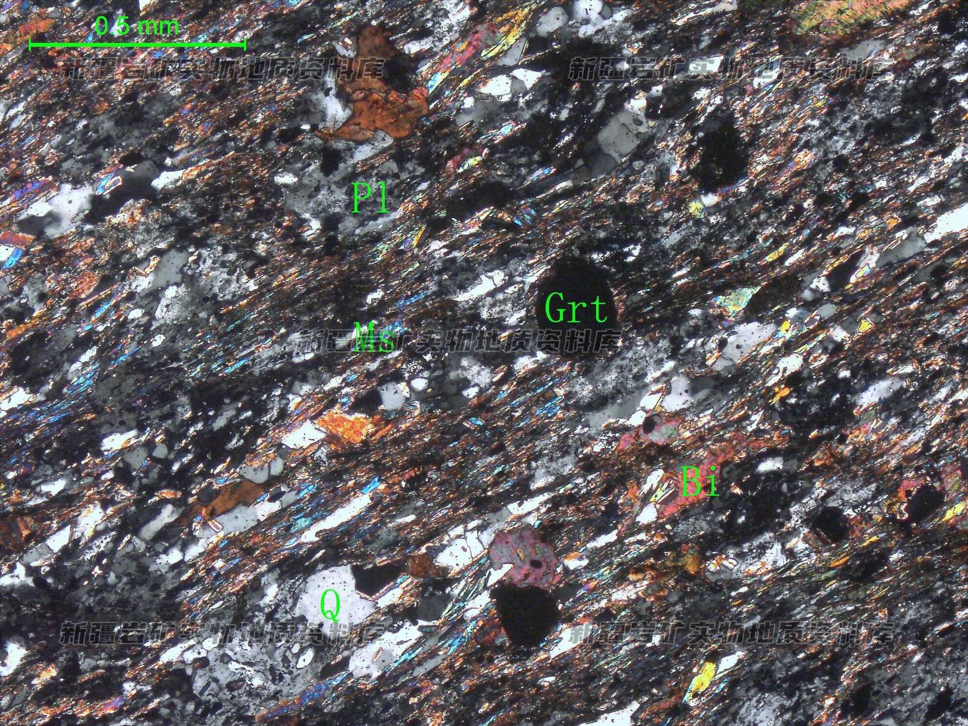 岩石特征描述: 斜长石(Pl)、石英(Q)多呈他形细粒状,呈透镜状、条带状集合体定向分布,其间分布细条带状黑云母(Bi)、白云母(Ms),石榴石(Grt)呈浑圆粒状,分布在岩石中,受糜棱化作用,片理显示波状皱曲。