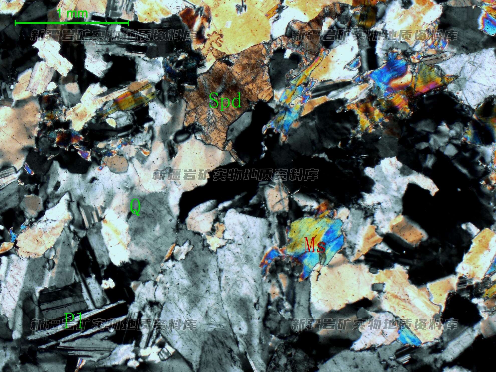 岩石特征描述: 斜长石(Pl)、石英(Q)呈他形粒状,斜长石具轻度泥化,石英具波状消光,白云母(Ms)多呈半自形叶片状,锂辉石(Spd)呈他形粒状、短柱状,较均匀分布在斜长石、石英之间。