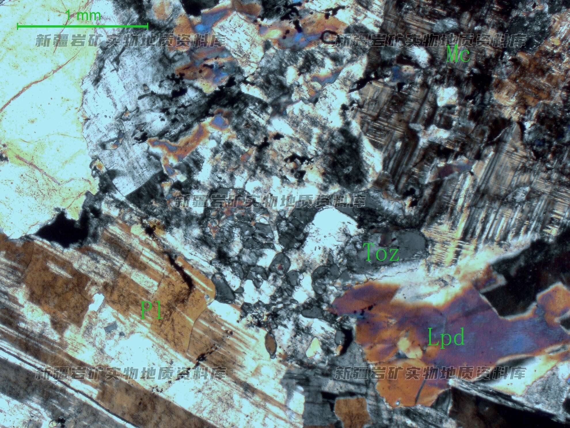 岩石特征描述: 岩石主要由斜长石(Pl)组成,多硅锂云母(Lpd)含量少,呈片状分布,黄玉(Toz)呈他形粒状,微斜长石(Mc)具格子双晶,表面泥化。