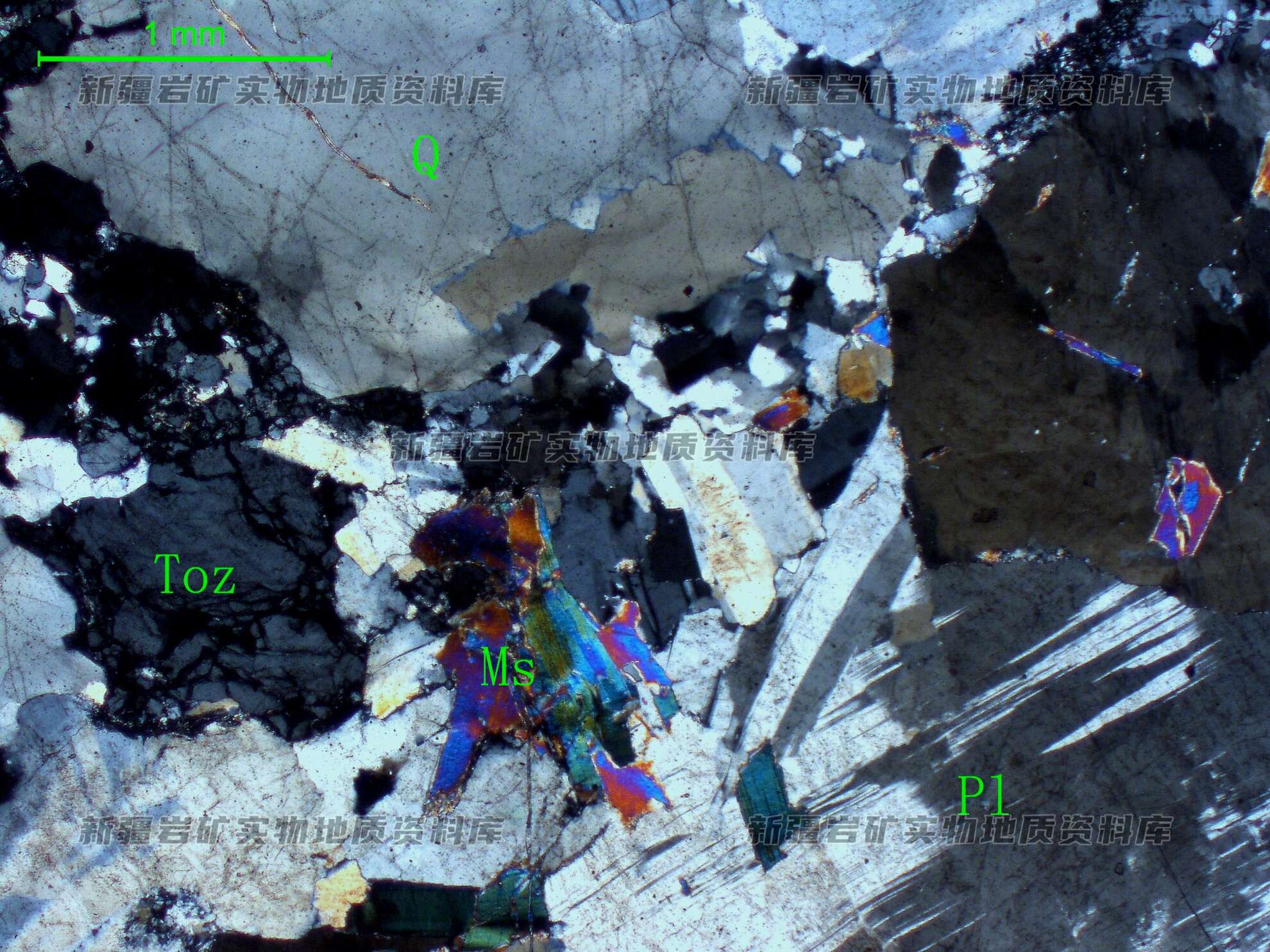 岩石特征描述: 斜长石(Pl)呈半自形板状,石英(Q)呈他形粒状具镶嵌状消光,白云母(Ms)呈半自形叶片状,黄玉(Toz)呈他形粒状,相对集中分布在斜长石、石英、白云母之间,并具碎裂纹。