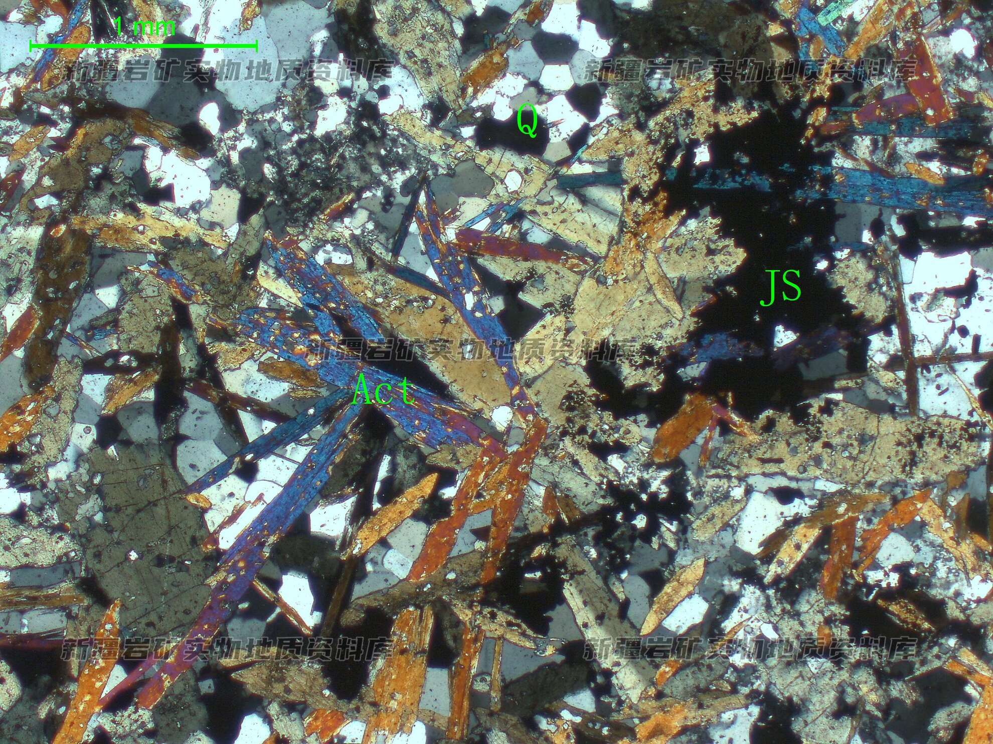 岩石特征描述: 阳起石(Act)呈半自形长柱状,其间分布他形粒状石英(Q)集合体,金属矿物(JS)呈他形粒状集合体,斑点状分布阳起石、石英之间。